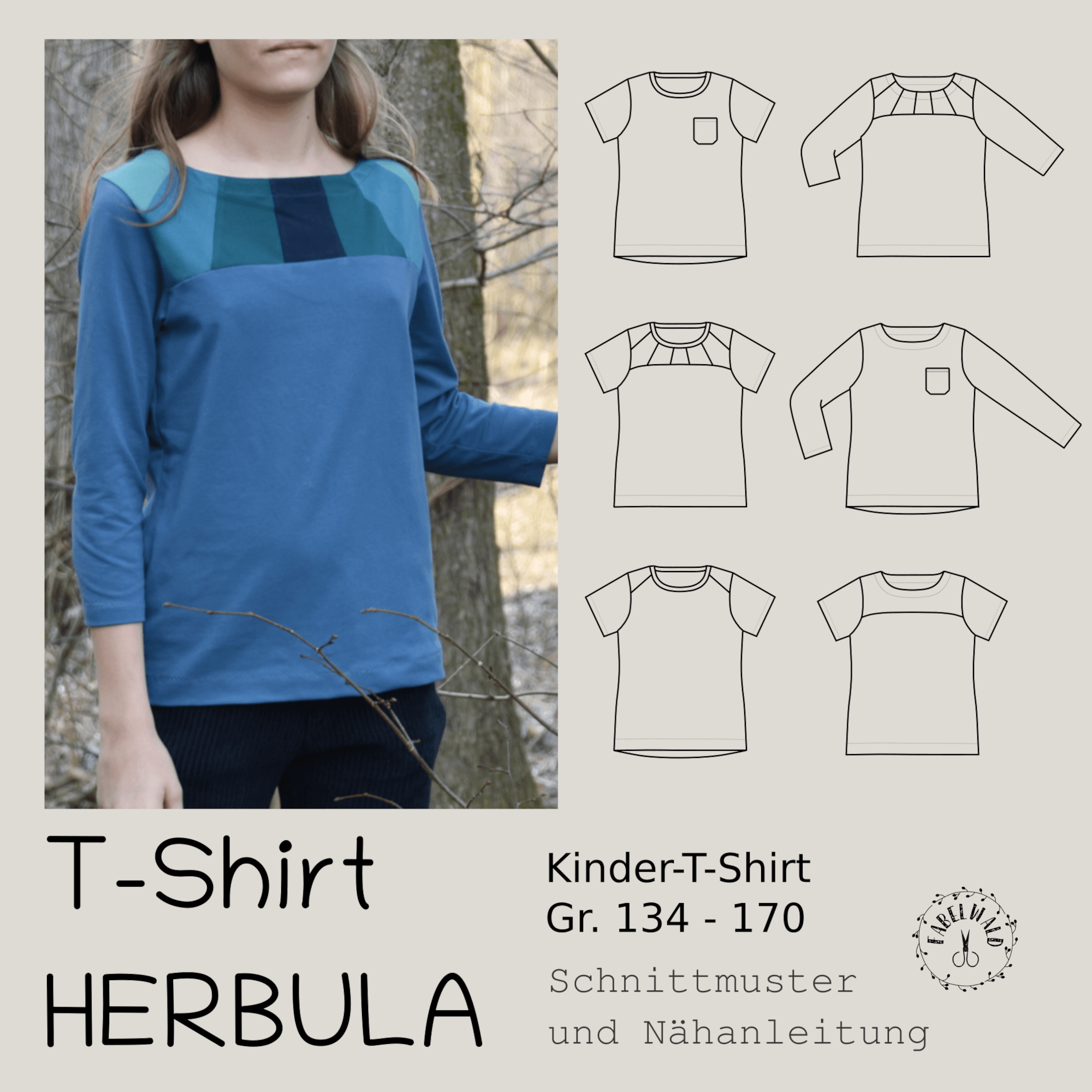 Herbula (lat. „Kräutlein“) ist ein T-Shirt-Schnittmuster für Mädchen in den Einzelgrößen 134 – 170. Herbula kann in verschiedenen Varianten und für alle Jahreszeiten genäht werden – ein besonderer Blickfang ist die mehrfach geteilte Passe am Vorderteil, aber auch ein ganz schlichtes Basic-T-Shirt ist möglich.
