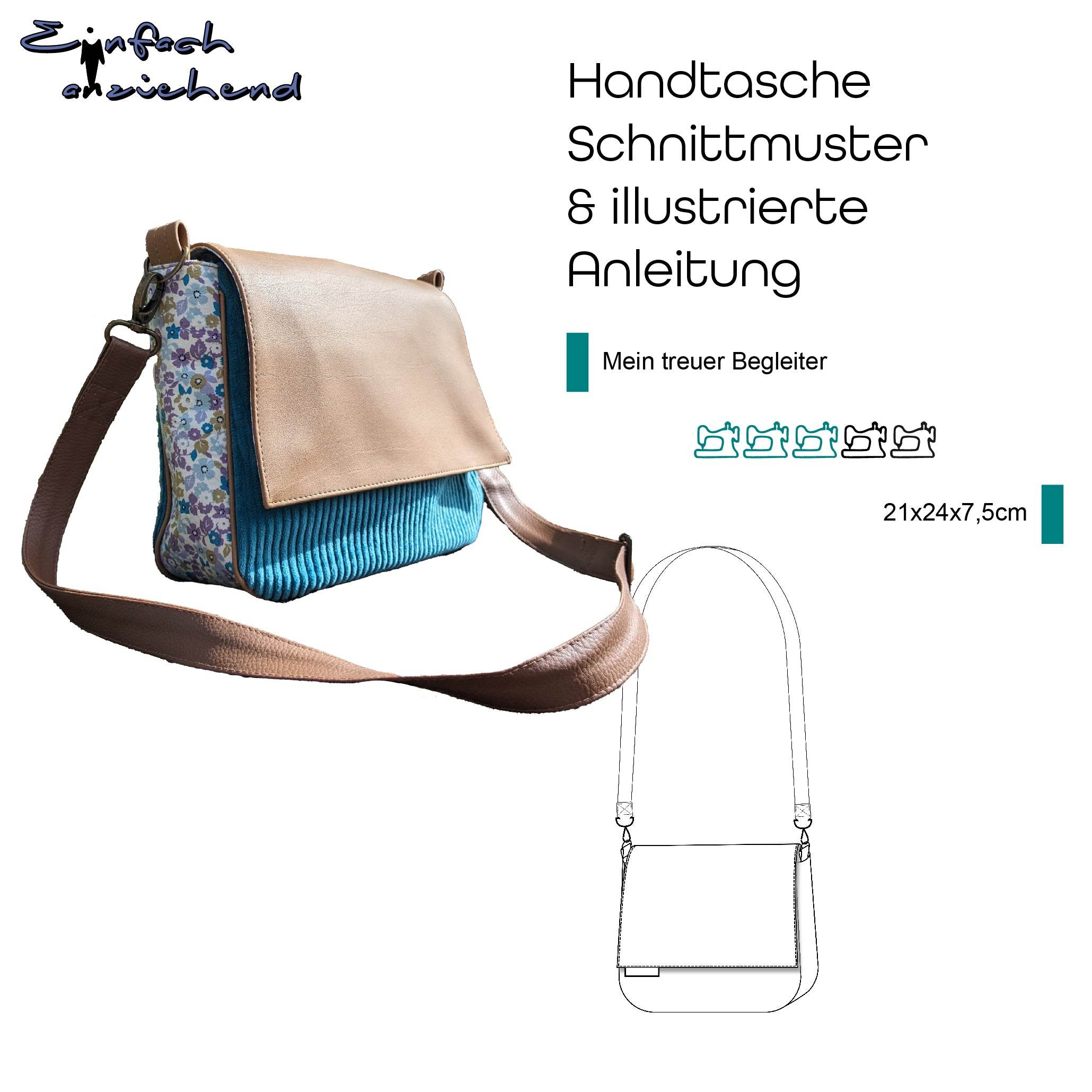Dieser Schnitt bietet dir eine Handtasche, mit einem optionalen Außenfach mit Reißverschluss, einem optionalem Innenfach mit Reißverschluss, einem Trennfach mit Reißverschluss, einem optionalen Hauptreißverschluss, einer Taschenklappe und einem extra stabilen Boden für guten Stand und trägt den schönen Namen "Mein treuer Begleiter". Das Schnittmuster beinhaltet natürlich eine ausführliche Anleitung und die Fertigmaße 21x24x7,5cm und wird dir nach dem Kauf als Sofort Download in PDF Format zur Verfügung gestellt.