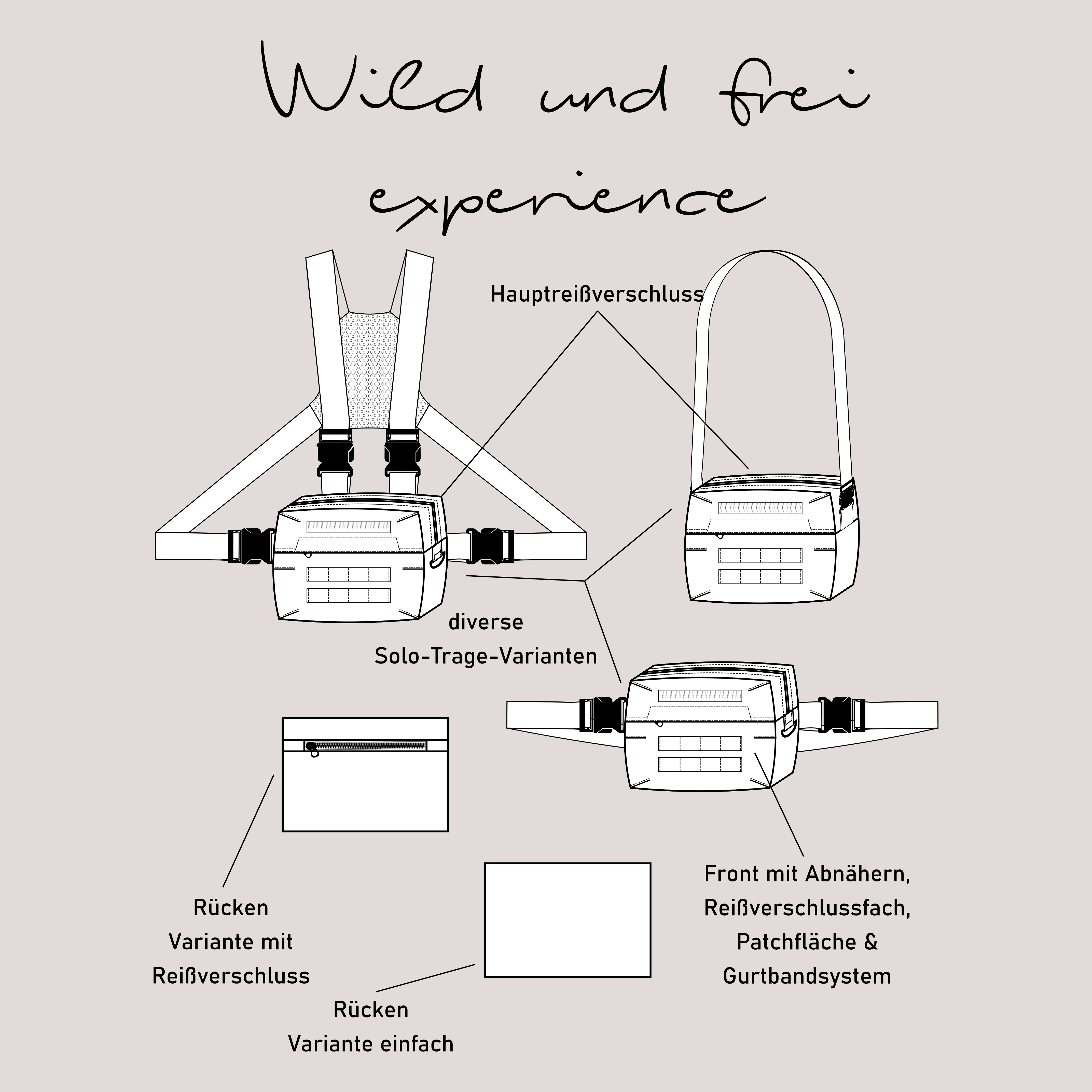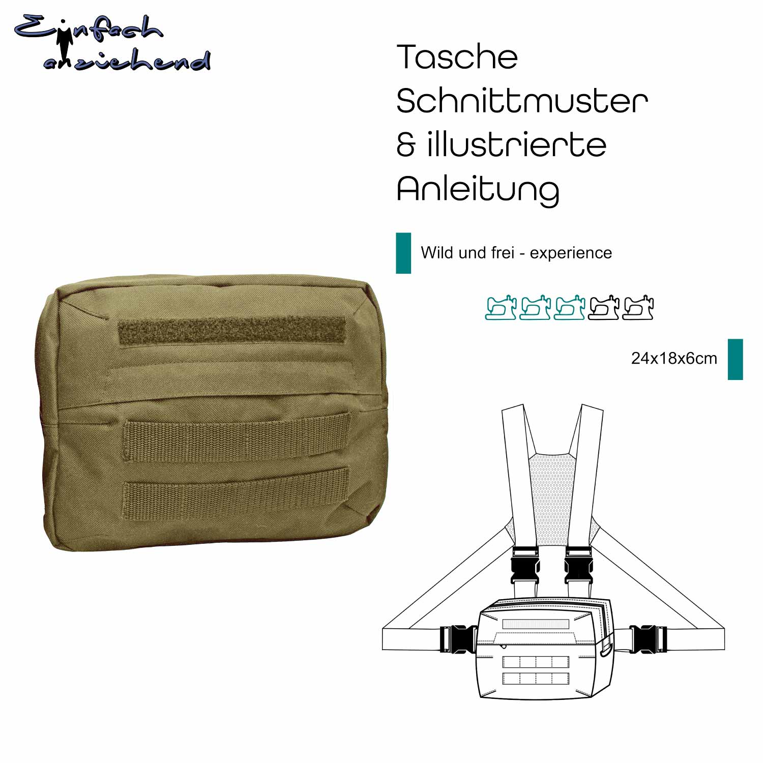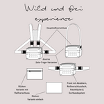 Dieser Schnitt bietet dir eine große Tasche für viele Dinge und kann einzeln getragen werden als Bauchtasche, Handtasche, Brusttasche oder Crossbodybag. Zu kannst sie zudem durch die Adapterfunktionen um kleinere Taschen erweitern und trägt den schönen Namen "Wild und frei - experience". Das Schnittmuster beinhaltet natürlich eine ausführliche Anleitung und die Fertigmaße 24x18x6cm und wird dir nach dem Kauf als Sofort Download in PDF Format zur Verfügung gestellt.