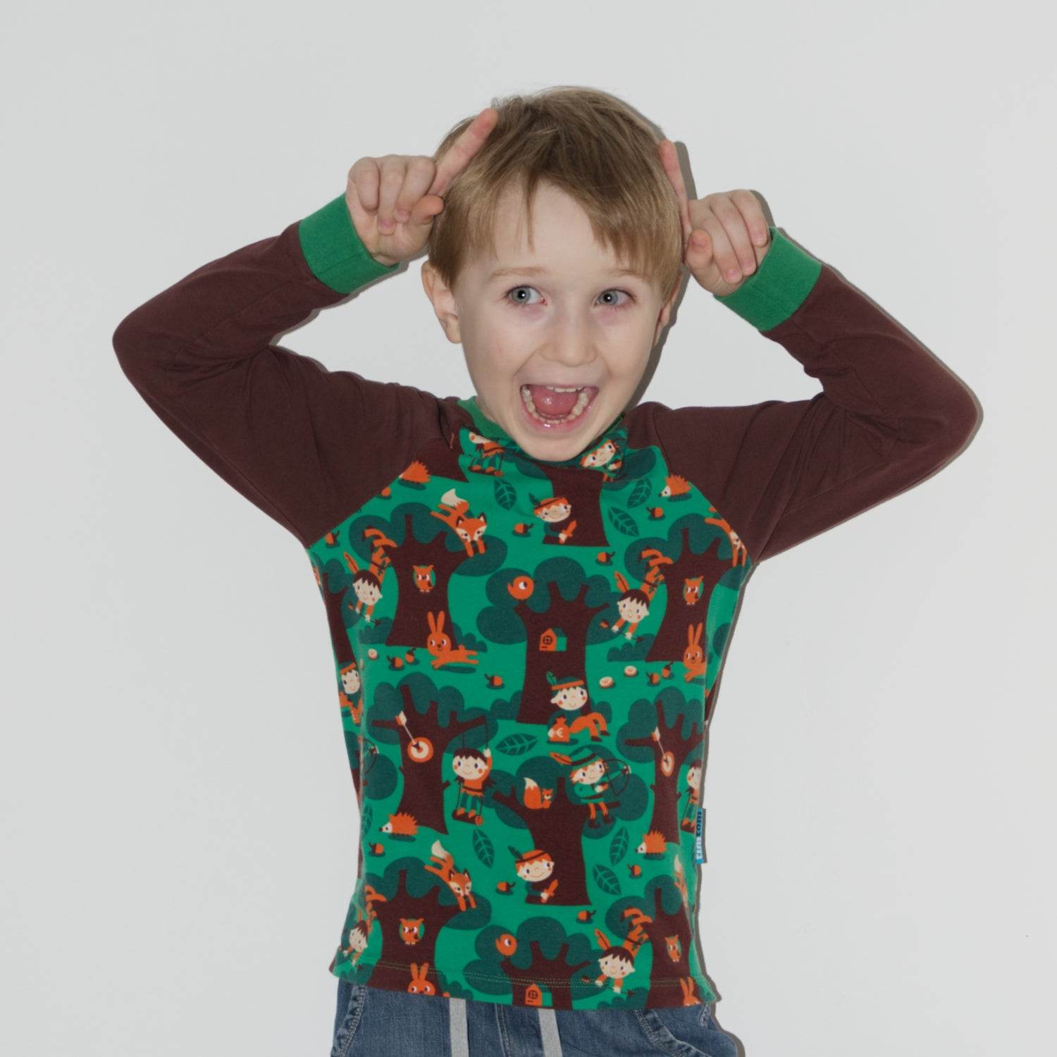 Vorne wie hinten identisch – das Shirt kann nicht „falsch herum“ angezogen werden! Super für kleine Selbstanzieher oder verträumte Kids, die’s eilig haben. Der Ausschnitt ist weit genug zum einfachen Anziehen, aber nicht so weit, dass Unterwäsche hervorschaut.