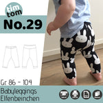 timtom No.29 ist ein Schnittmuster für eine bequeme Leggings, speziell entwickelt für Babys und Kleinkinder im Windelalter. Der Schnitt enthält die Größen 50-104 als Einzelgrößen.