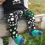 Die Leggings sitzt angenehm am Bauch und Po, während die Hosenbeine eng anliegen, aber nicht einengen. Dadurch gibt es keine Druckstellen oder störende Nähte auf empfindlicher Haut. Im Oberschenkelbereich ist ausreichend Platz für kleine Speckbeinchen, und der Schrittbereich enthält in allen Größen eine Windelzugabe.