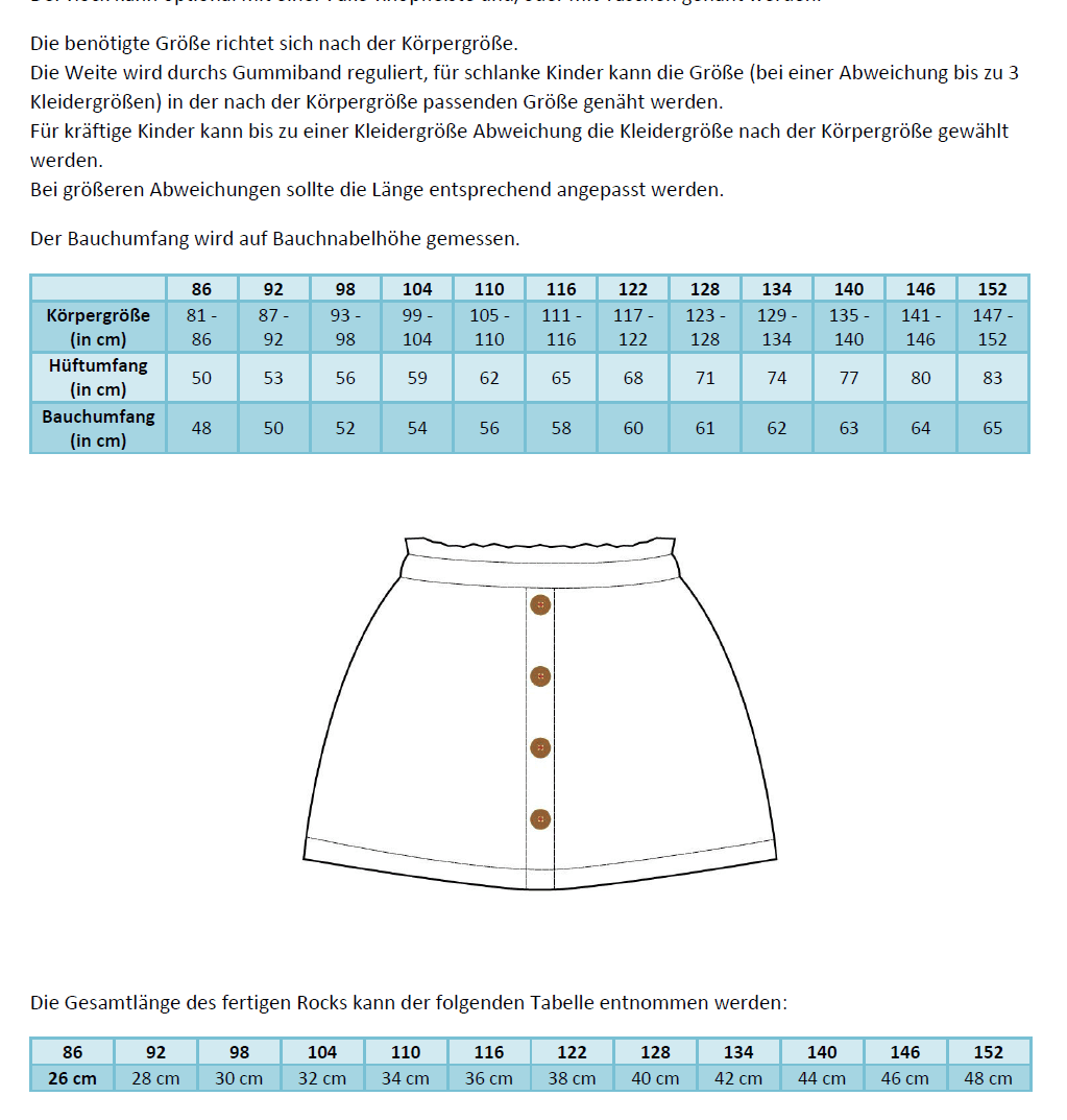 Das Schnittmuster ist ideal für Webware wie Baumwolle, Musselin, Cord oder leichte Jeansstoffe. Auch Jersey oder Sweatstoffe sind eine Alternative, wenn du einen besonders bequemen Rock nähen möchtest.