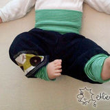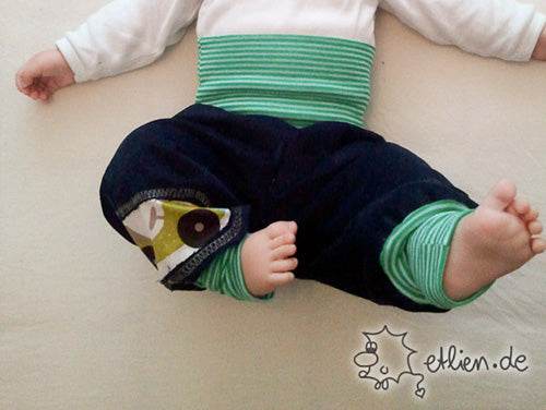 timtom No.9 ist ein vielseitiges Schnittmuster für eine Babyjeans oder Knickerbocker, speziell für Kinder im Windelalter mit den Einzelgrößen 56-104. Die Hose wächst über drei Kleidergrößen mit und ist dank der Krempelbündchen an den Beinen ideal für Tragekinder – einfach die Bündchen herunterklappen, wenn die Hose hochrutscht, und schon bleiben die Beine warm.