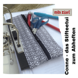 Das Stifteetui „Conne“ ist sehr praktisch für Schule, Studium und Job, da es sich in einem Ringordner (DIN A5 aufwärts) abheften lässt. Es hat Platz für Lineal, Schere und mehrere Stifte, die sich durch den oben liegenden Reißverschluss gut erreichen lassen. Besonders ist die Kombination von Baumwollstoff und SnapPap. Wenn du kein SnapPap zur Hand hast, kannst du auch Baumwollstoff mit Dekovil verstärken. Das Schnittmuster enthält schon die Nahtzugabe und die vielen Fotos zeigen dir detailliert, wie du vorgehst.