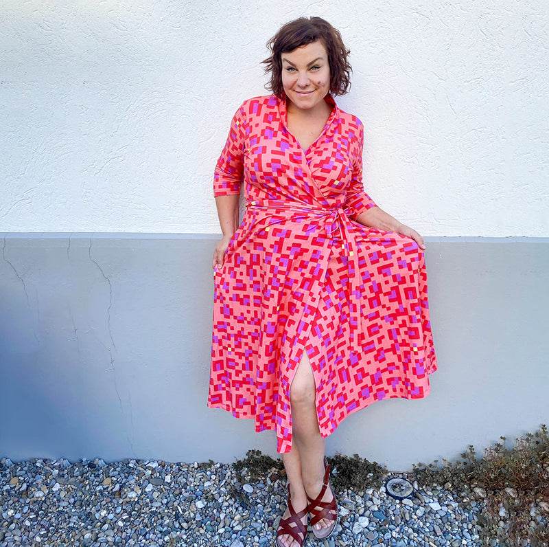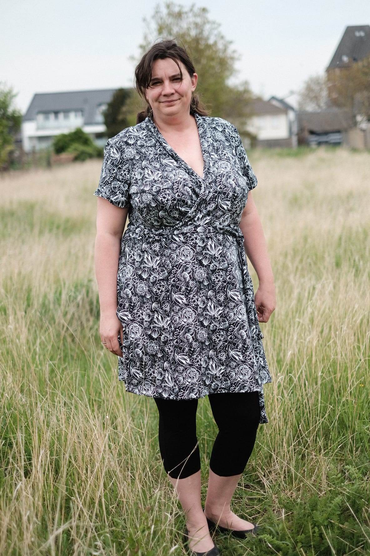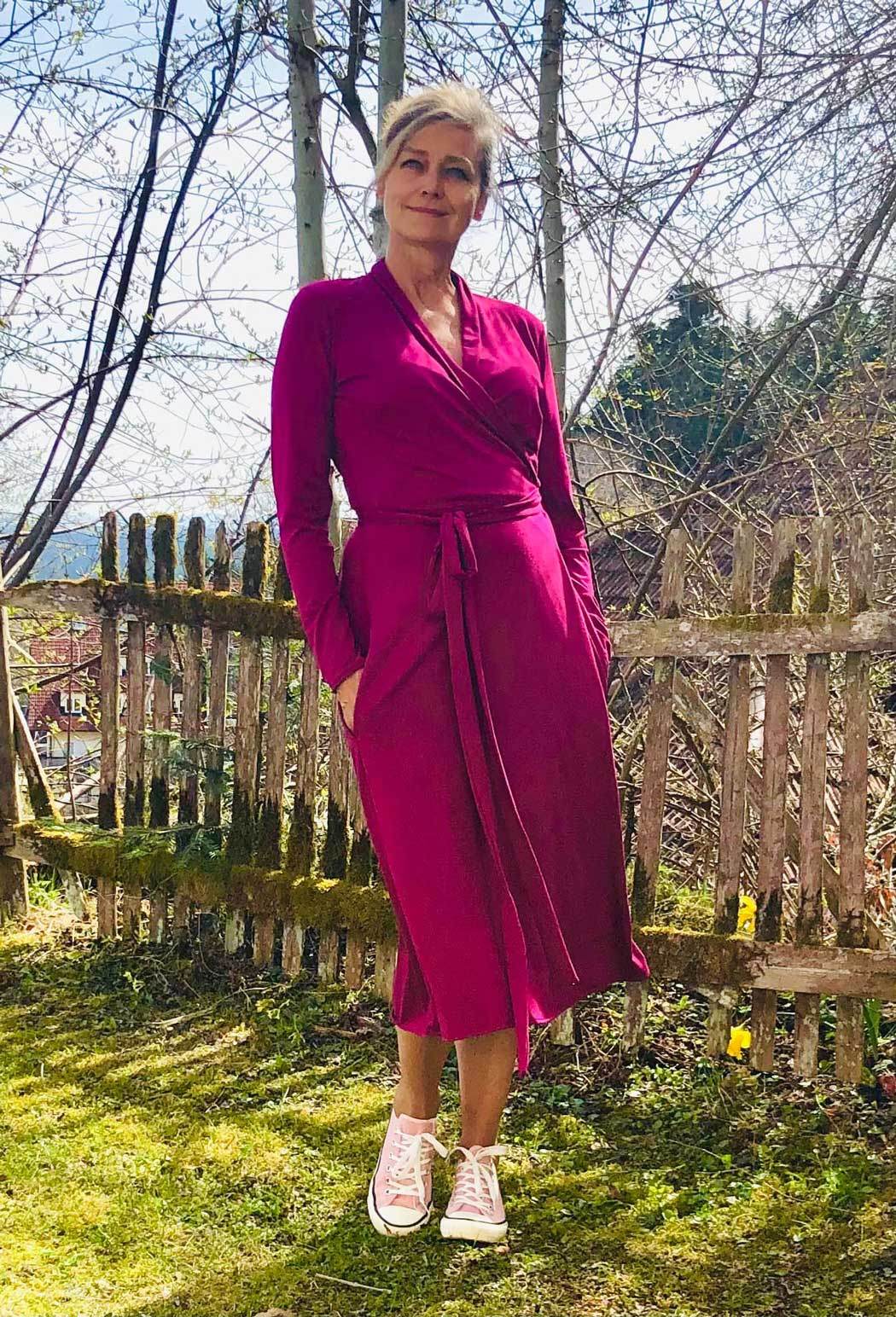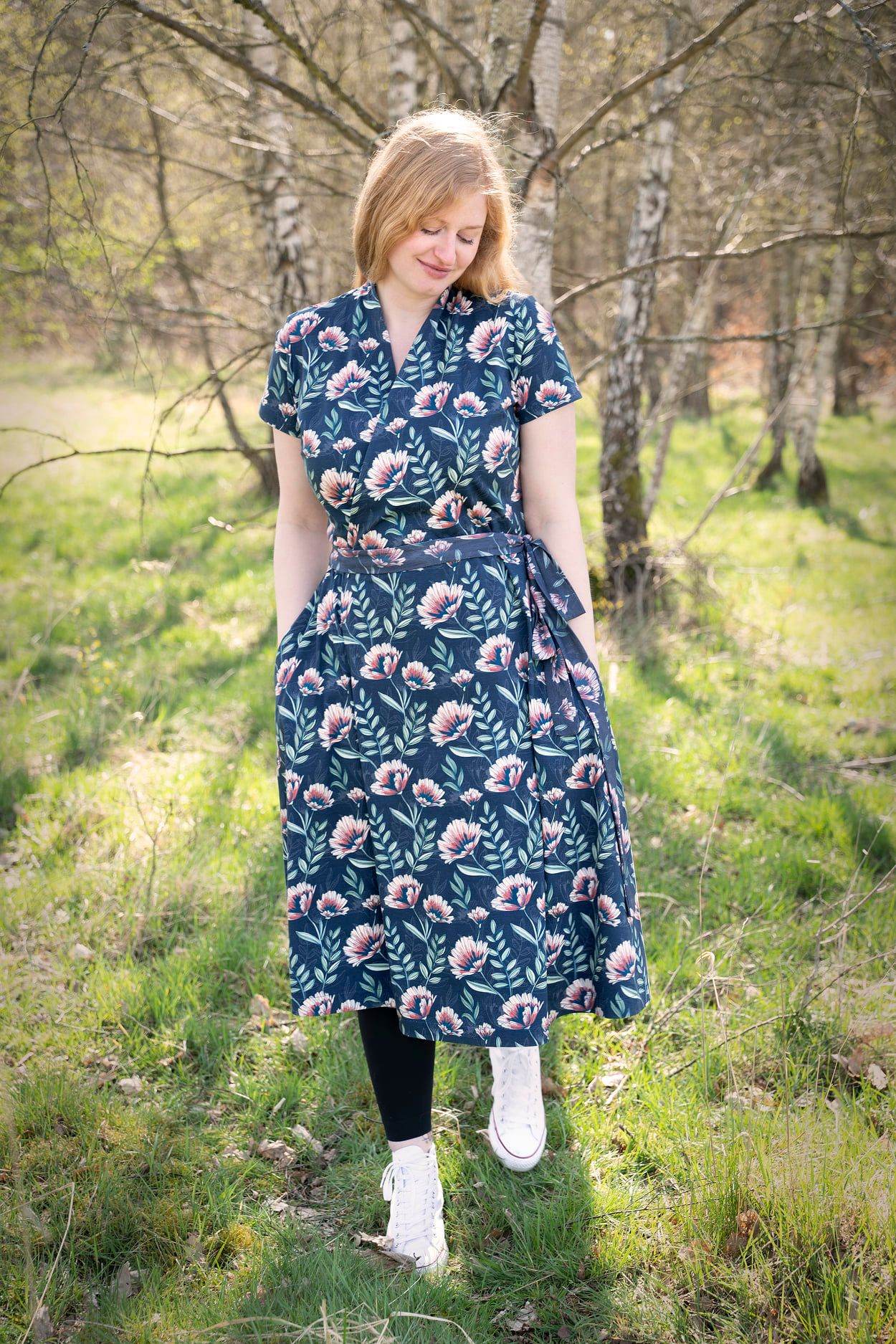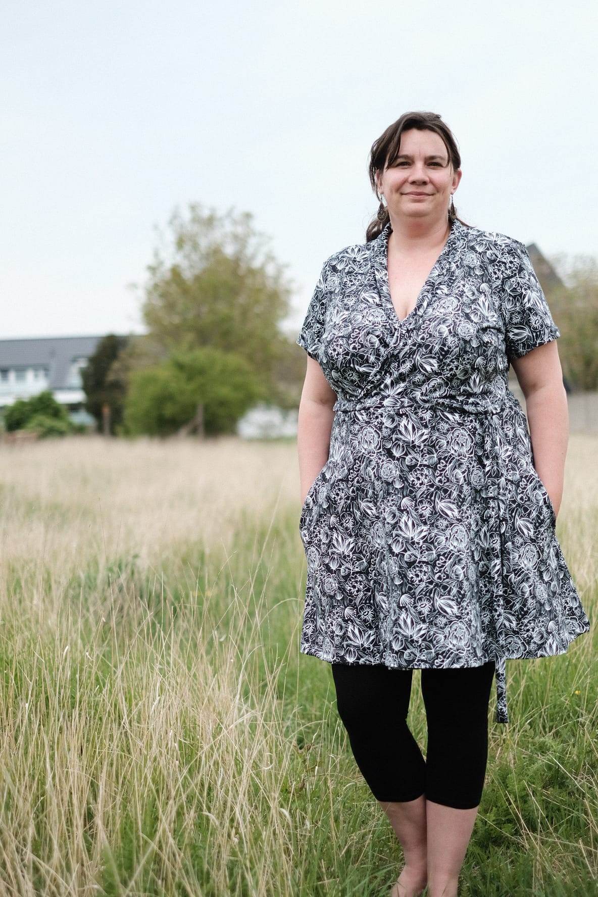 Aurora ist ein schönes weibliches Wickelkleid das an der Brust figurnah sitzt und ab der Taille ausgestellt fällt. Die Vorderteile des Oberteils liegen doppelt (gefüttert). Der schöne Schalkragen betont das Dekolleté und kann offen oder geschlossener getragen werden. Das Schnittmuster enthält zwei Rocklängen, drei Ärmellängen sowie seitliche Nahttaschen. Zum Vernähen eignen sich weiche, dehnbare Stoffe, wie Jersey, Viskosejersey, Punta di Roma, dünner Sommersweat etc.