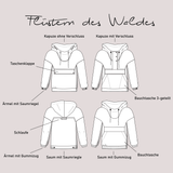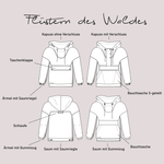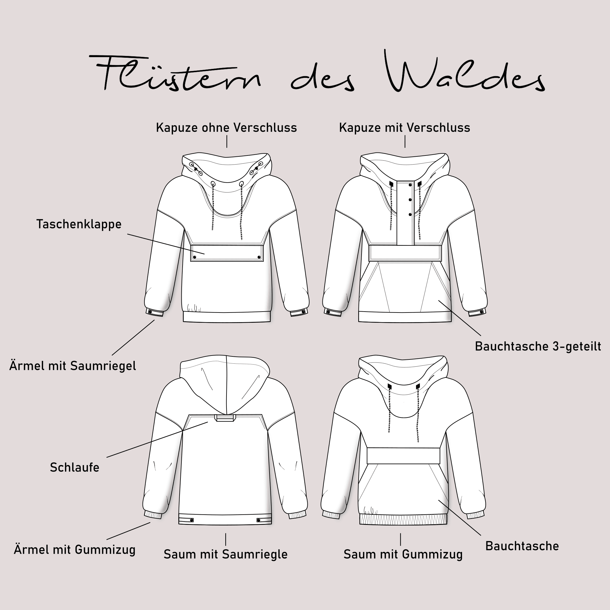 Dieser Schnitt für einen Windbreaker oder Sweater mit Kapuze und optionaler Tasche mit wahlweise mehreren Fächern, Gummizügen oder Riegeln an Ärmelsaum und Saum, sowie einem optionalen Frontreißverschluss bis zur Tasche, trägt den schönen Namen "Flüstern des Waldes". Das Schnittmuster beinhaltet natürlich eine ausführliche Anleitung und die Damen Größen 32 - 62 und wird dir nach dem Kauf als Sofort Download in PDF Format zur Verfügung gestellt.