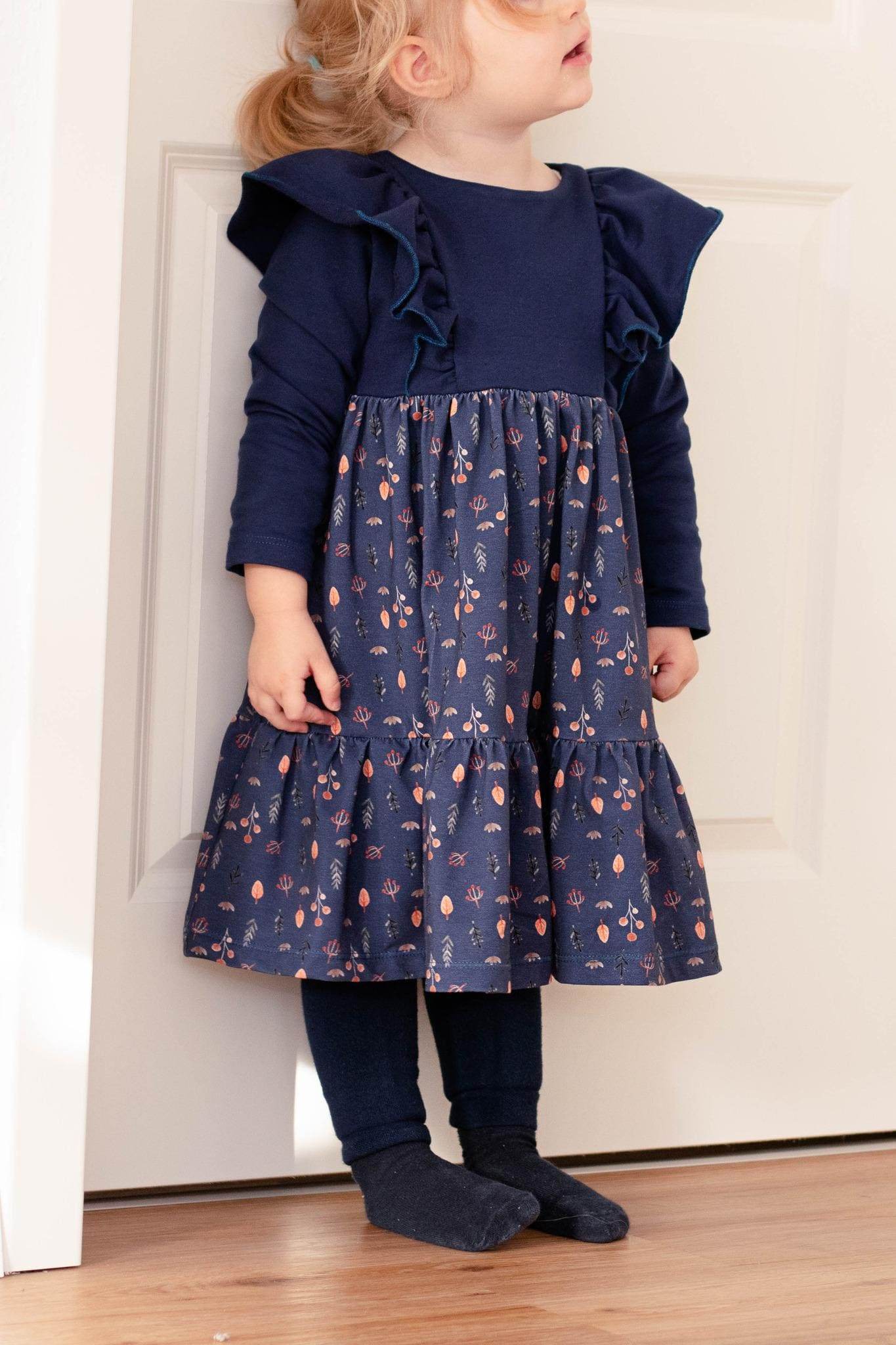 Die „Wintersonne“ ist ein romantisches Stufenkleid für Mädchen, das durch seine verspielten Rüschen, die ausgestellte Form und die bequeme Passform überzeugt. Der Schnitt eignet sich perfekt für kühlere Tage, lässt sich aber auch wunderbar in der Übergangszeit tragen – je nach Stoffwahl.