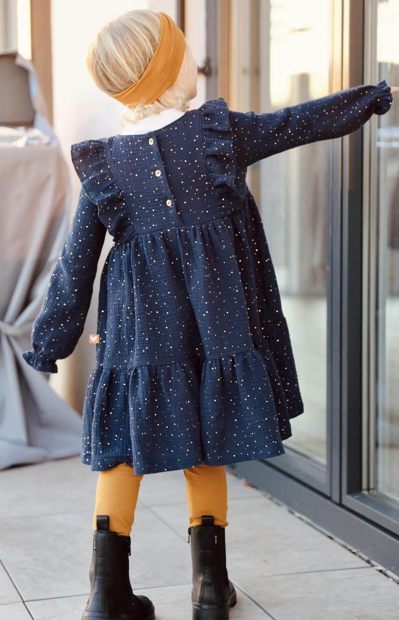 „Wintersonne“ verbindet Komfort mit einem festlichen Look. Durch die weiten Stufen und die Rüschen entsteht ein Kleid, das beim Spielen genauso gut sitzt wie auf einem besonderen Anlass. Ein echter Liebling – nicht nur im Winter!
