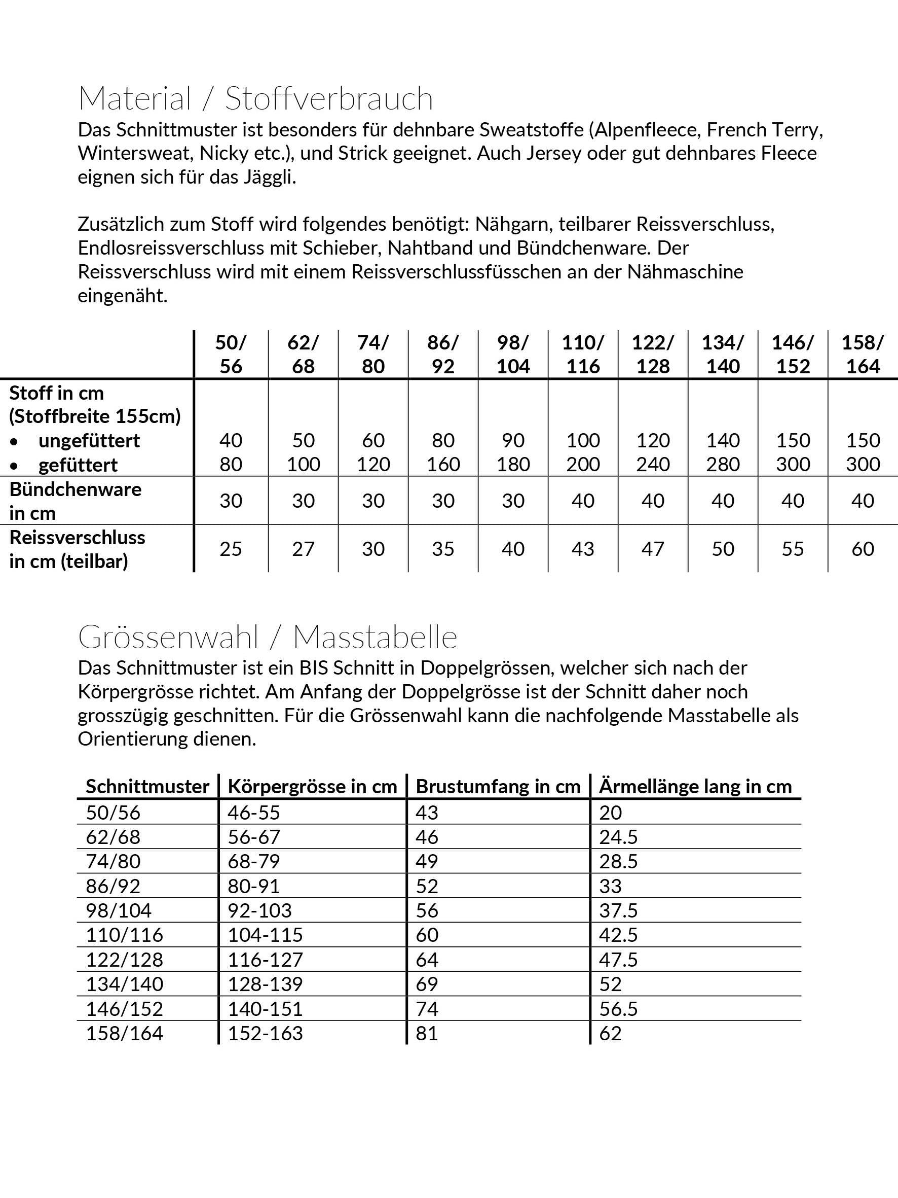 - Nähgrösse 50-164 in Doppelgrössen