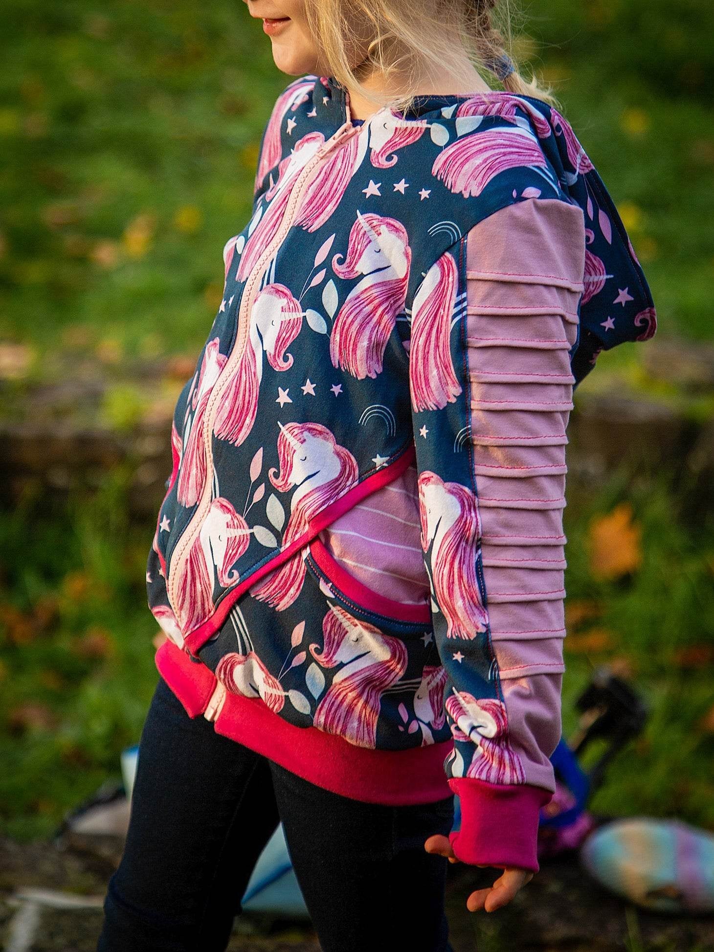 - Stoffempfehlung: French Terry, Sweat, Alpenfleece, Jersey, Rippjersey, Waffeljersey etc.