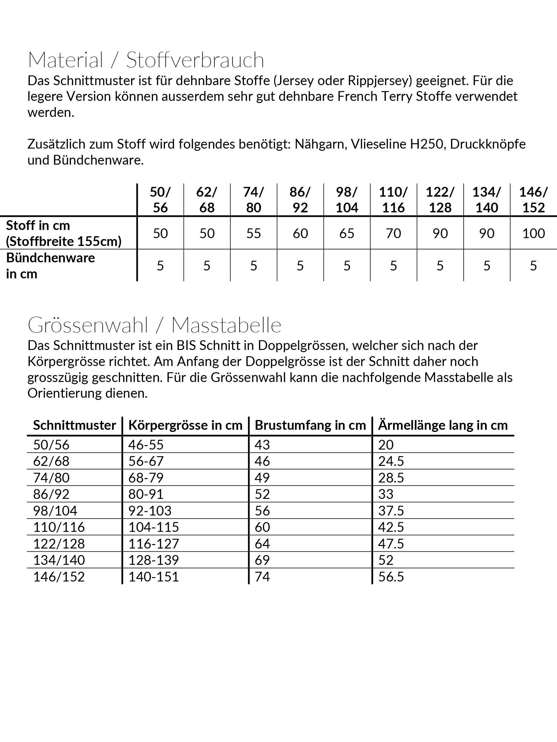 - Nähgrösse 50-152 in Doppelgrössen