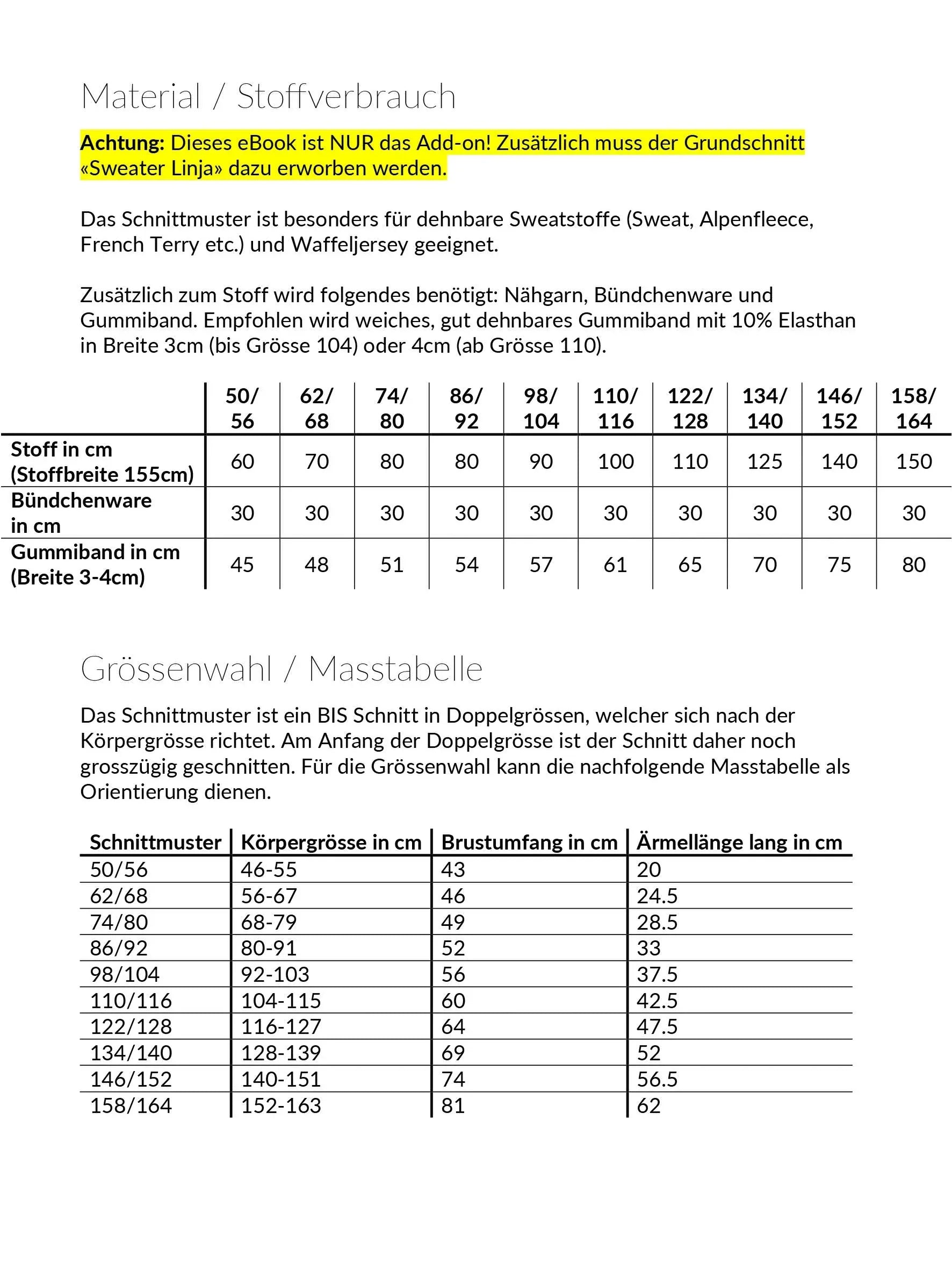 Achtung: Dieses eBook ist NUR ein Add-on! Zusätzlich muss dazu der Grundschnitt "Sweater Linja" erworben werden.