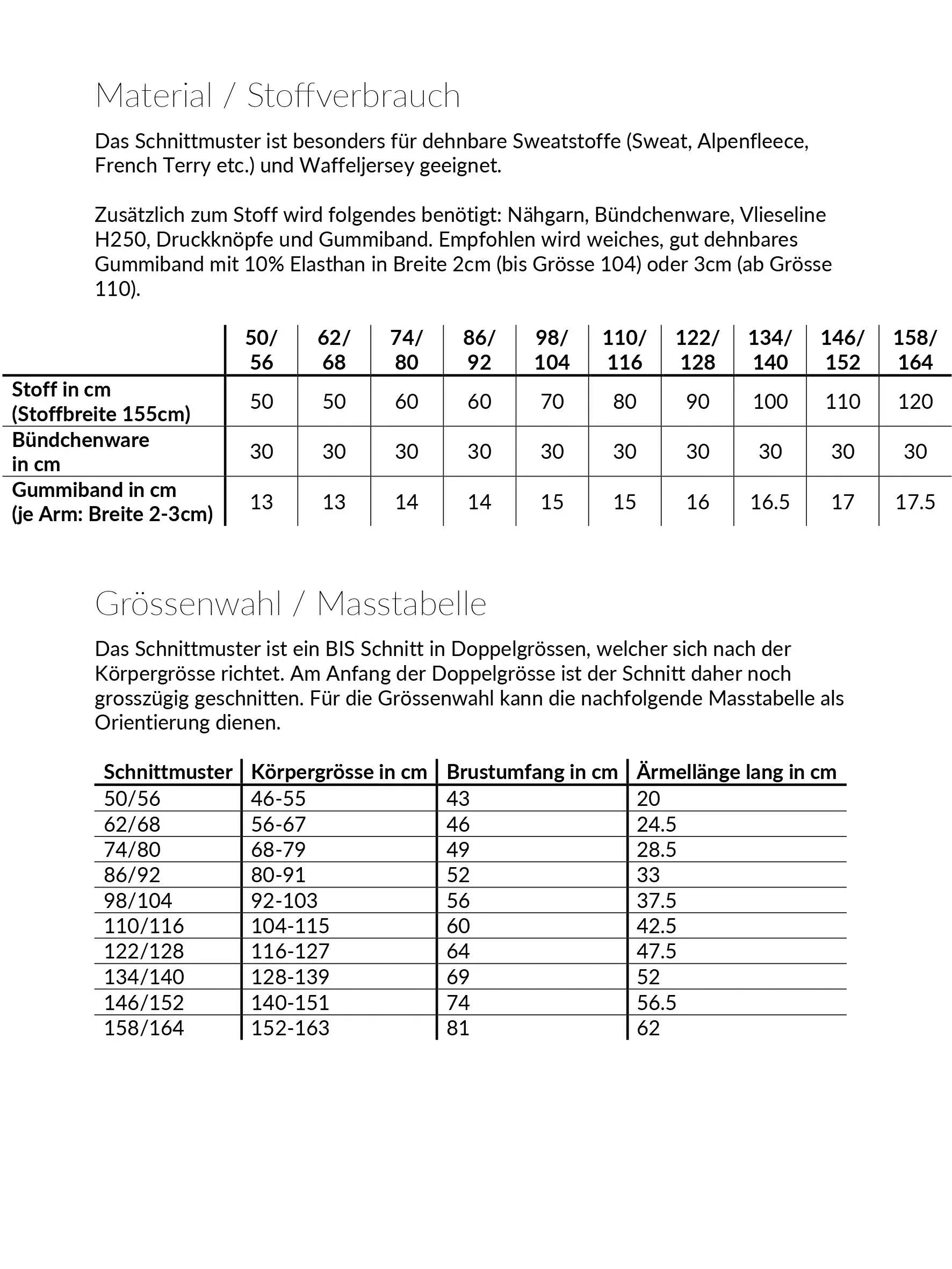 - Nähgrösse 50-164 in Doppelgrössen