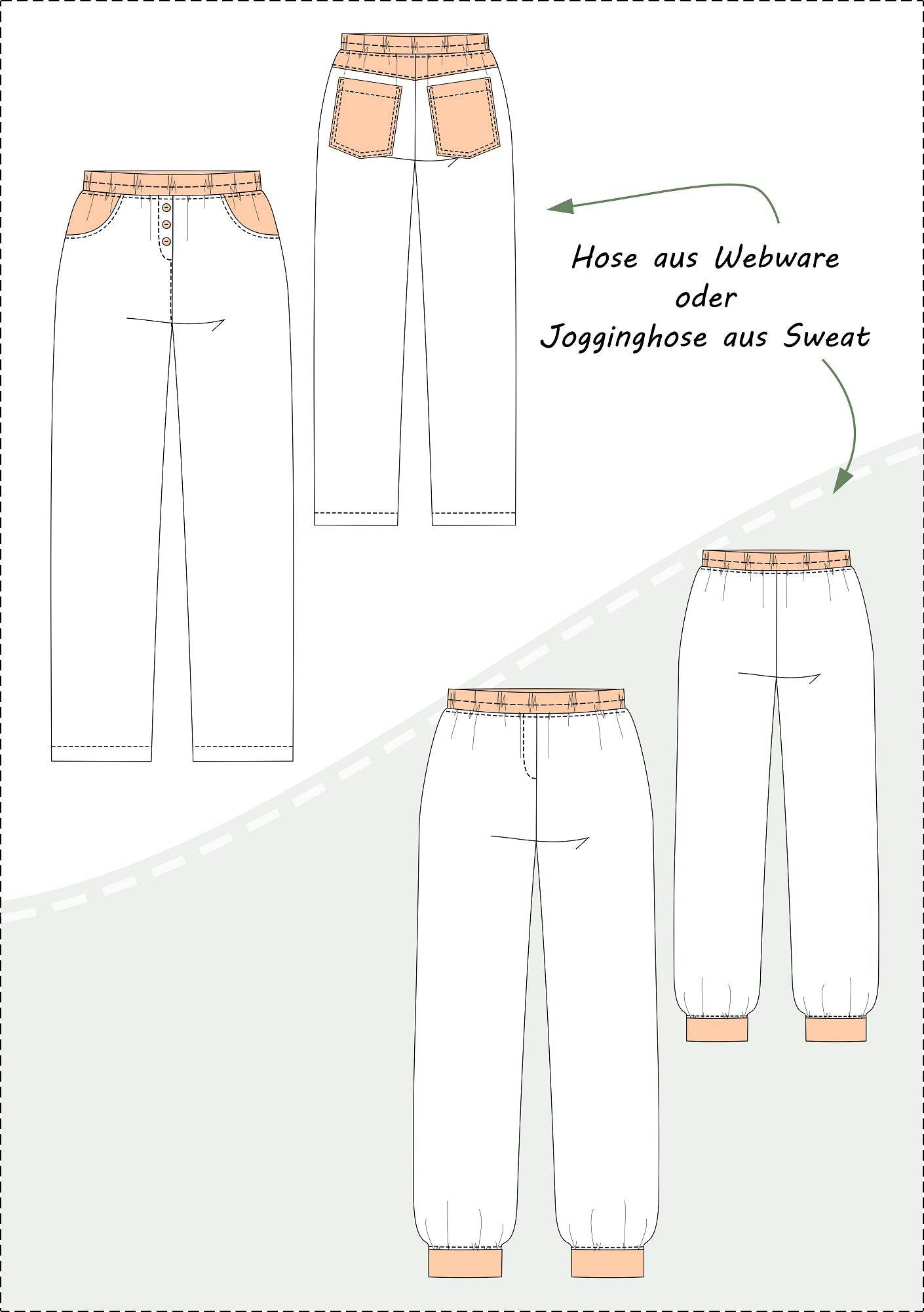 „Toni“ wird mit einem praktischen Gummibund genäht, der individuell angepasst werden kann. Optional kannst du Vordertaschen und Gesäßtaschen einarbeiten, um Stauraum für kleine Schätze zu schaffen. Eine zusätzliche Variante mit Fake-Reißverschluss verleiht der Hose einen coolen Look.