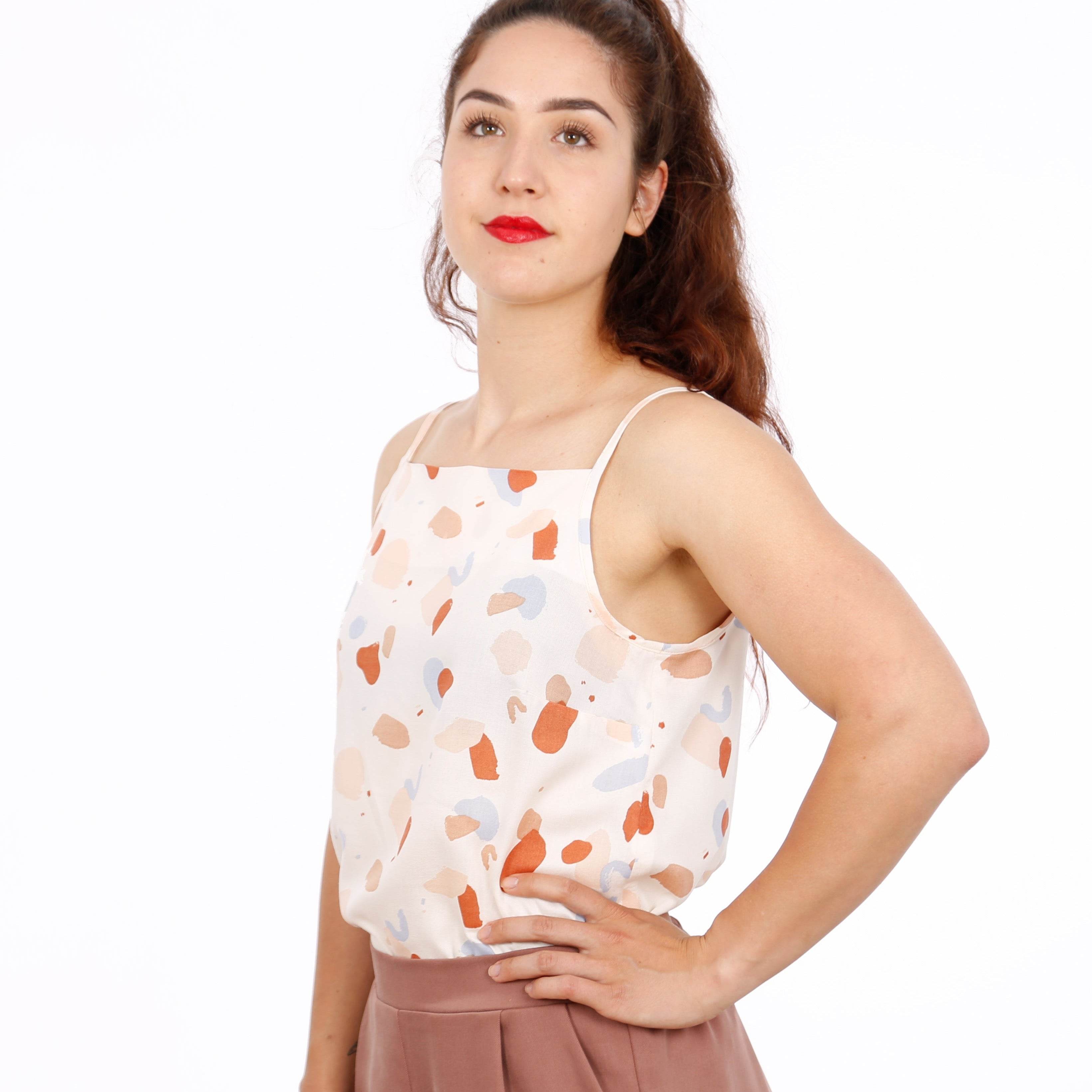 Mit FRAU HELEN kann der Sommer kommen. Ob im Büro, in der City oder auf der Party, mit diesem eleganten Top mit dünnen Trägern und geraden Ausschnittkanten ist man immer luftig und dennoch chic angezogen. FRAU HELEN liebt feine, fließende Stoffe und passt zu Mustern genauso gut wie zu schlichten Stoffen.