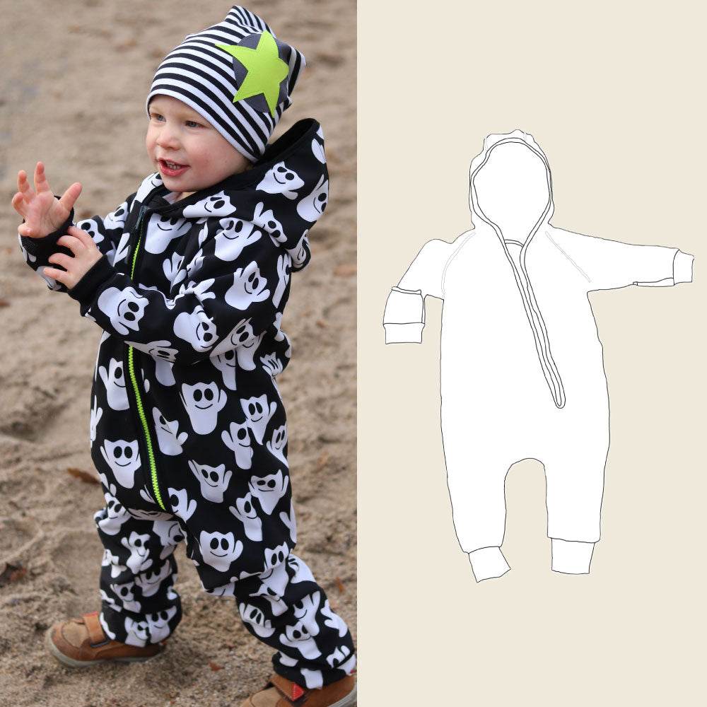 Der Schnitt ist ausgelegt für Fleece, Doubleface-Fleece, Baumwollfleece, Wollwalk, Softshell, Teddyplüsch und Alpenfleecesweat. Wenn du möchtest, kannst du die Kapuze oder auch den ganzen Anzug mit einer zweiten Lage Jersey füttern.