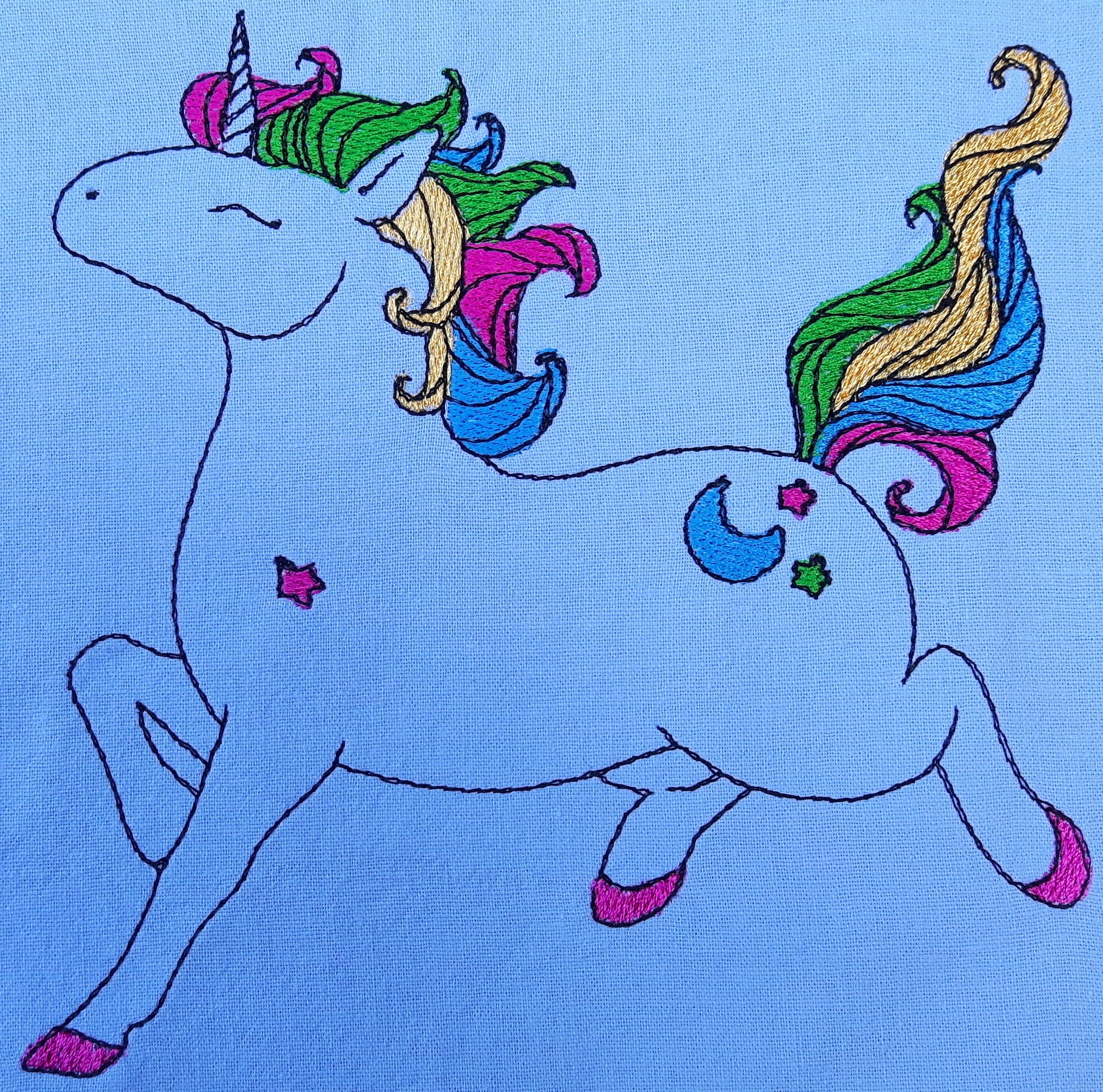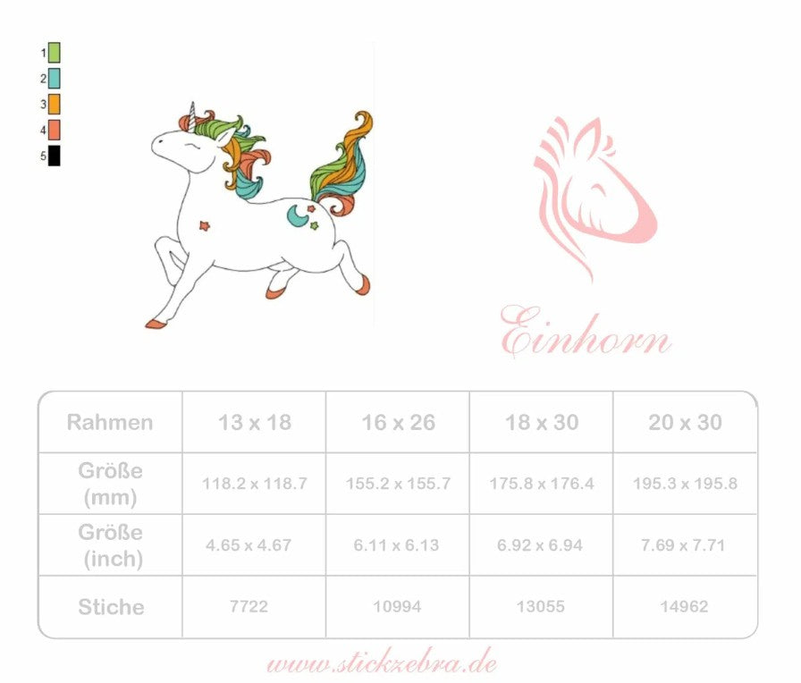 Mit seiner bunten Mähne, den verspielten Sternchen und dem kleinen Mond auf der Kruppe bringt dieses Einhorn magischen Glanz in deine Stickprojekte. Die schwungvolle Pose und das fröhliche Doodle-Design machen es zu einem echten Hingucker, der sofort verzaubert. Ob auf Kissen, Kleidung, Taschen oder als Geschenk für kleine Einhorn-Fans – dieses Motiv sorgt überall für bunte Fantasie und märchenhafte Freude.