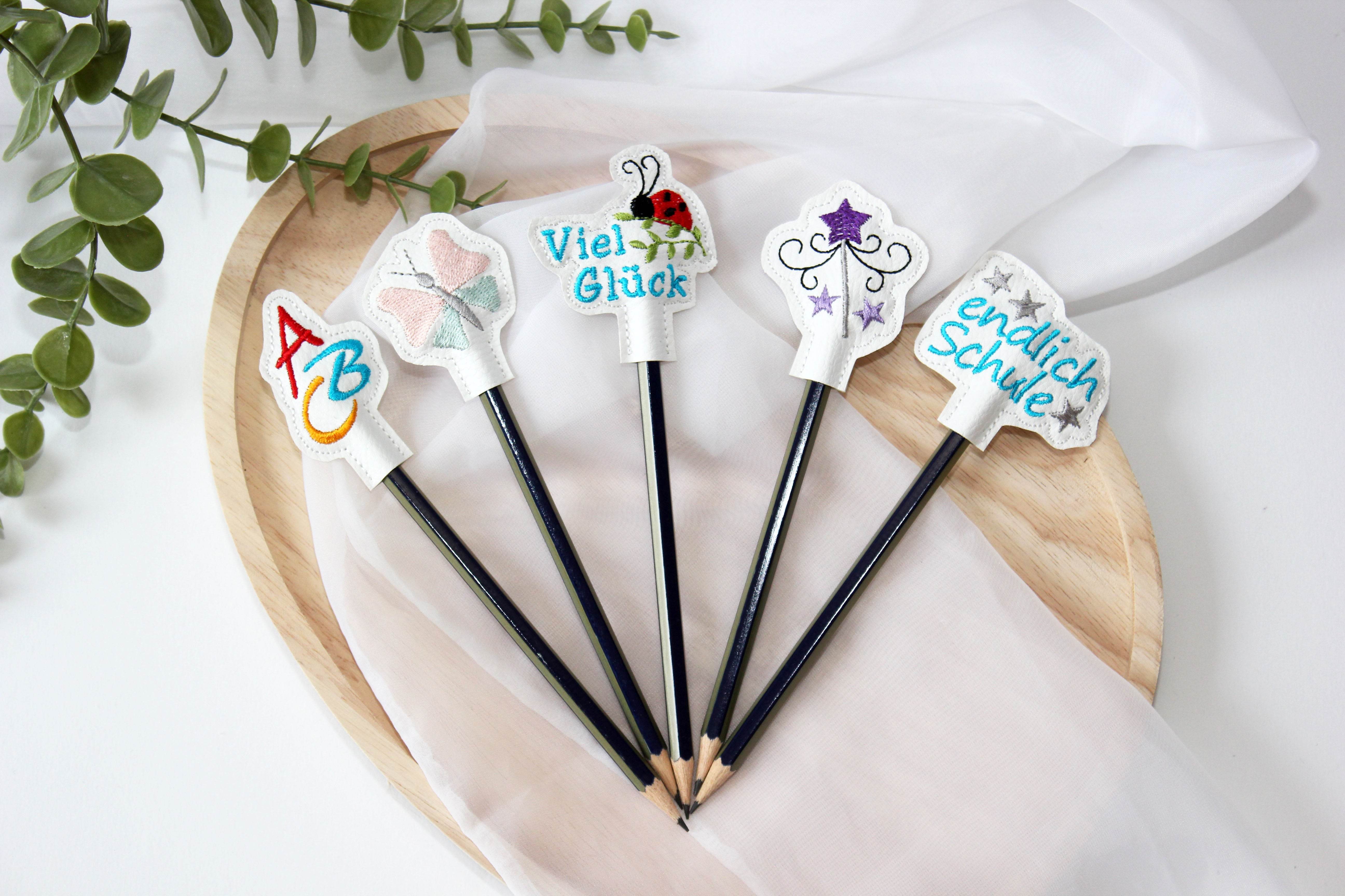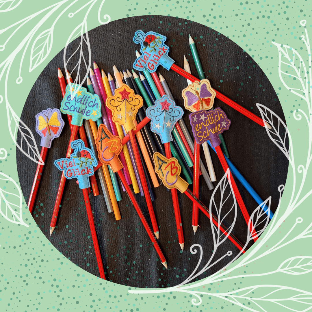 Diese ITH Stickdatei ist eine kleine bunte Mischung für süße Stiftetopper. Sie werden komplett im Rahmen gestickt und am Ende außen herum ausgeschnitten.