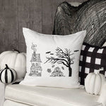 Halloween Town – Halloween Design mit gruseligen Häuschen, Kürbissen und knorrigen Bäumen. Ideal für Fensterbilder, Kissenbezüge und Halloween-Dekorationen.