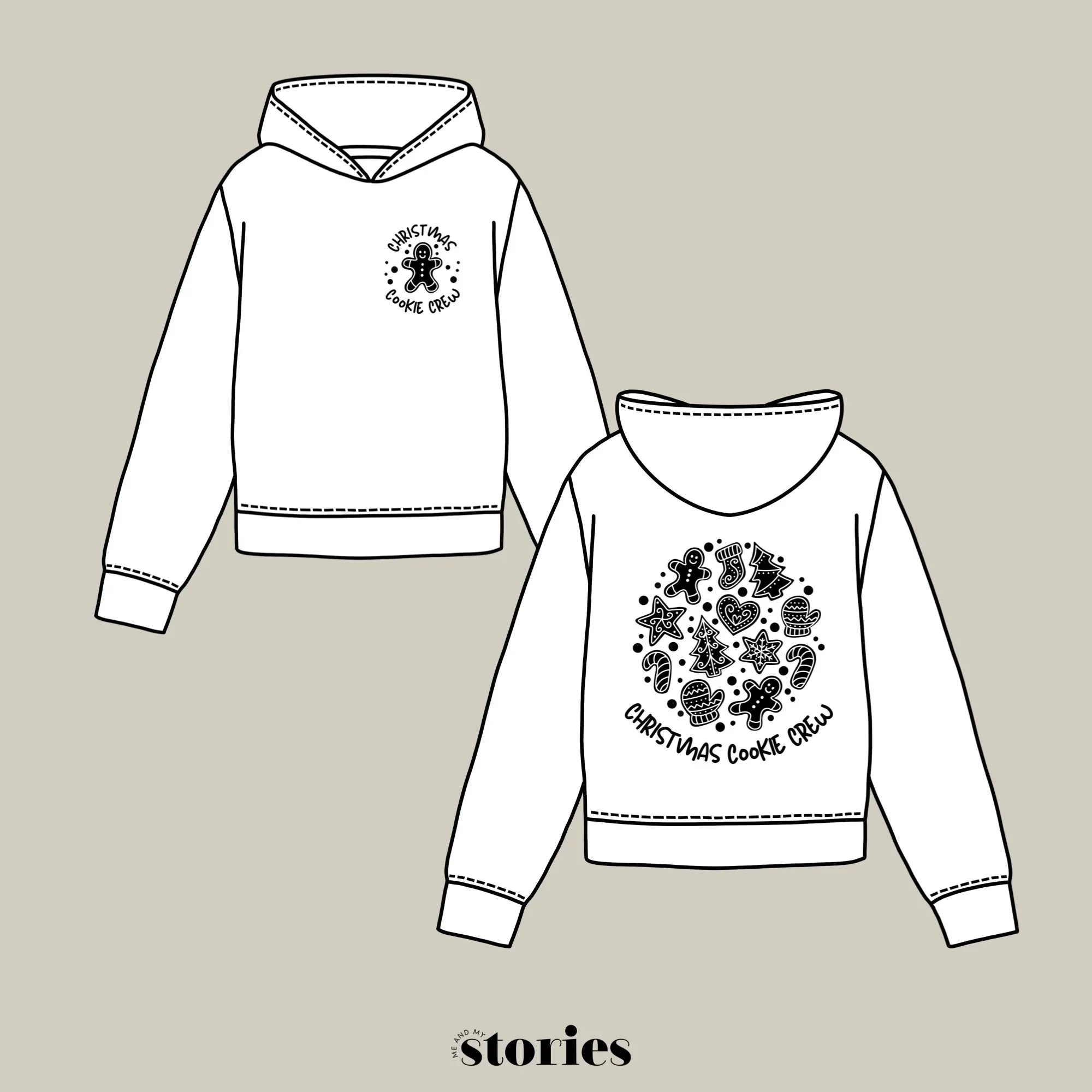 Der große Rückenprint zeigt eine liebevoll illustrierte Keks-Komposition aus Lebkuchen, Sternen, Zuckerstangen, Handschuhen und Tannen – kombiniert mit dem Statement Spruch „Christmas Cookie Crew“.