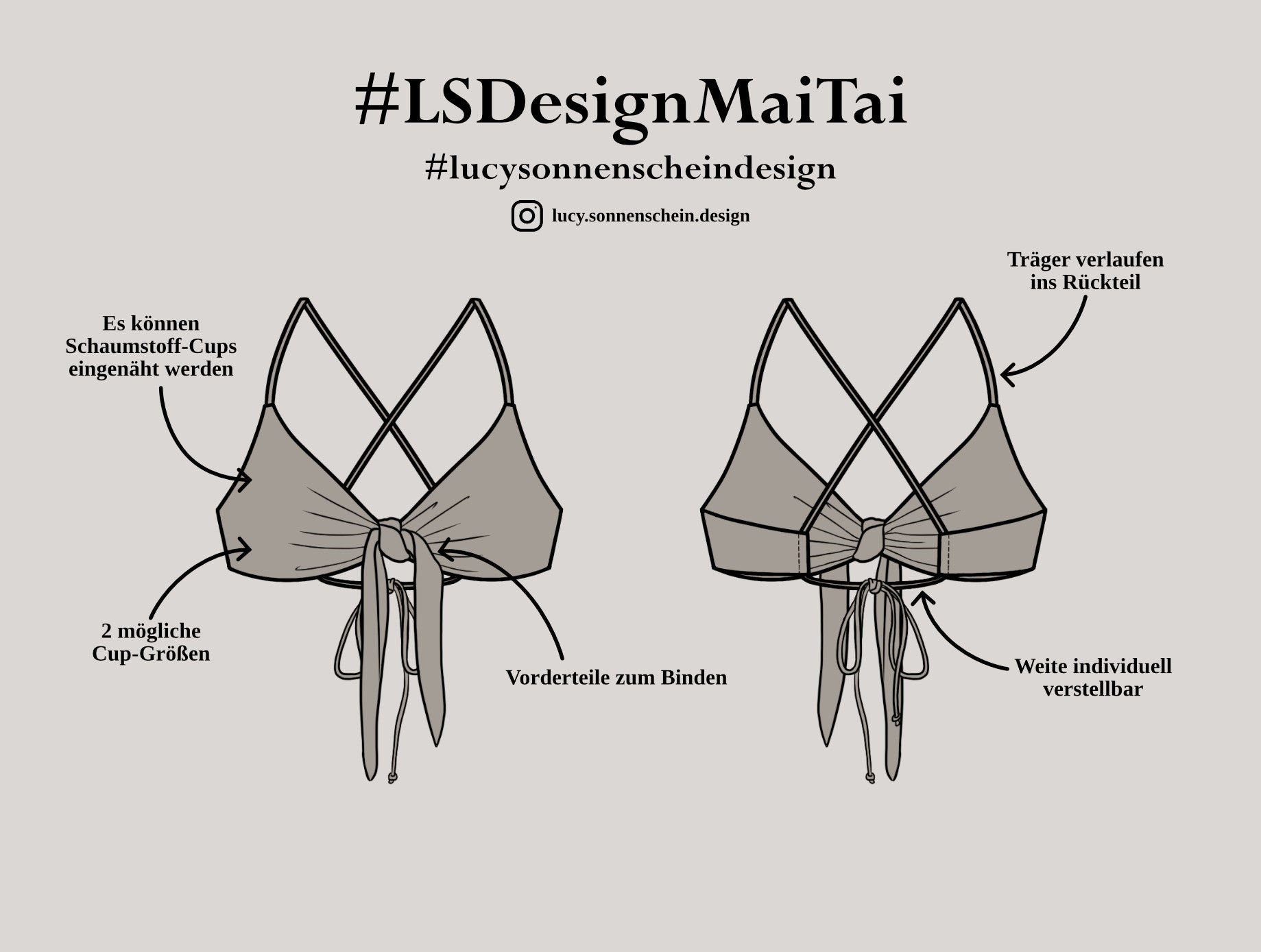 Je nachdem wie stark der Knoten in der vorderen Mitte zusammengezogen wird entsteht ein mehr oder weniger starker Push-Up Effekt. Außerdem können dadurch unterschiedliche Cup-Größen geformt