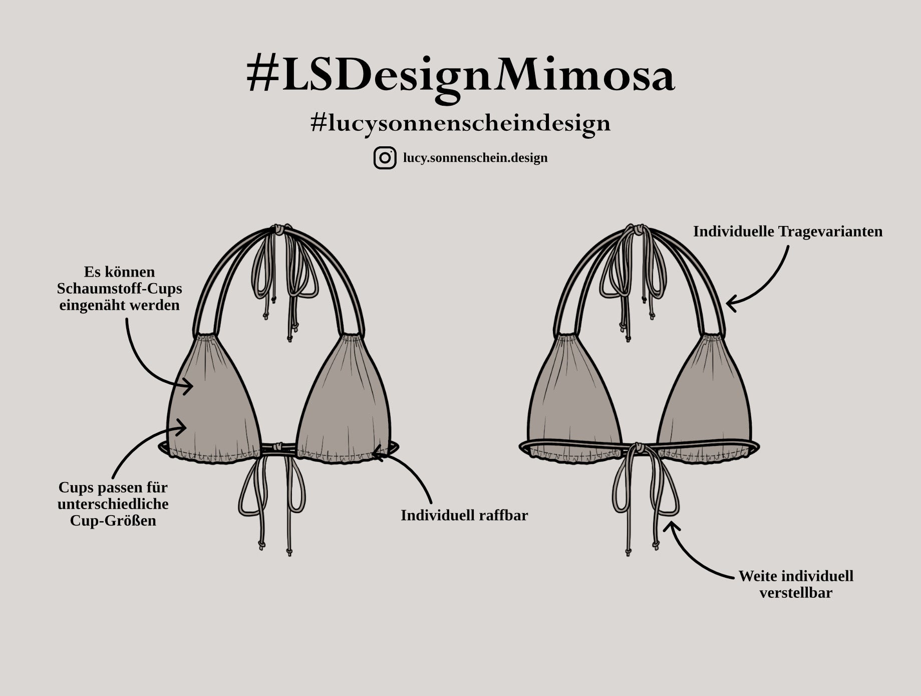 Die Passform des Bikini-Tops ist eng geschnitten. Dadurch muss unbedingt ein elastischer Stoff verwendet werden, damit er sich auf die Körpermaße dehnen kann. Je nachdem wie stark der Stoff im Bereich der Tunnel gerafft wird, kann die Passform selbst beeinflusst werden.