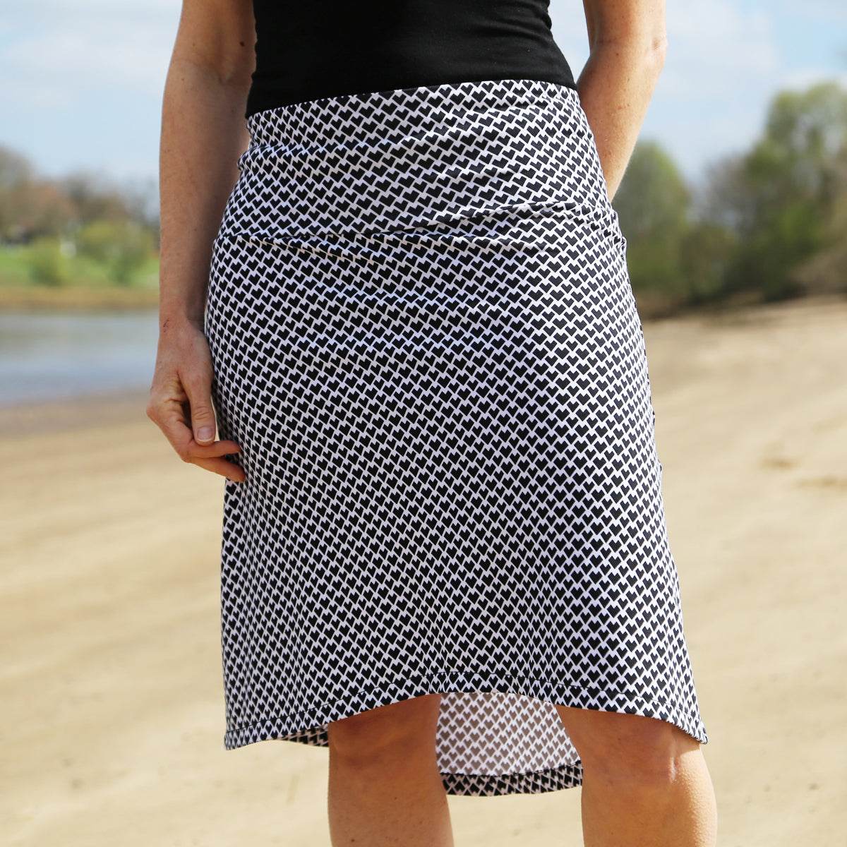 FRAU EVA ist ein bequemer Jerseyrock für entspannte Sommertage! FRAU EVA ist superschnell genäht und gehört in jede Urlaubsgarderobe. Er umschmeichelt sanft die Hüften und ist nach unten leicht ausgestellt. Der Saum läuft nach hinten lang aus und es entsteht ein toller Vokuhila“-Effekt. Das breite zweifarbige Jerseybündchen kann normal oder umgeklappt getragen werden, so läßt sich die Länge des Rockes nach Lust und Laune variieren.