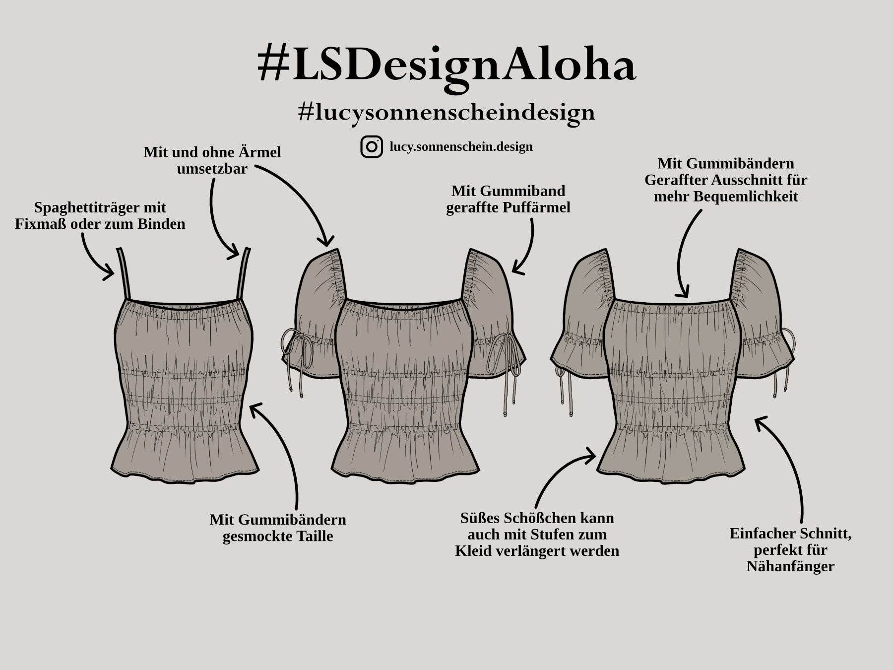 Besonders verspielt wirkt die kurze Puffärmel-Variante, bei der die Ärmel direkt ins Halsloch verlaufen. Für alle, die es noch luftiger mögen, enthält das Schnittmuster eine zweite Variante mit zarten Spaghettiträgern, ideal für heiße Sommertage. Durch die simple Nähtechnik eignet sich das Projekt hervorragend für Anfängerinnen oder alle, die schnell ein schönes Ergebnis sehen möchten.