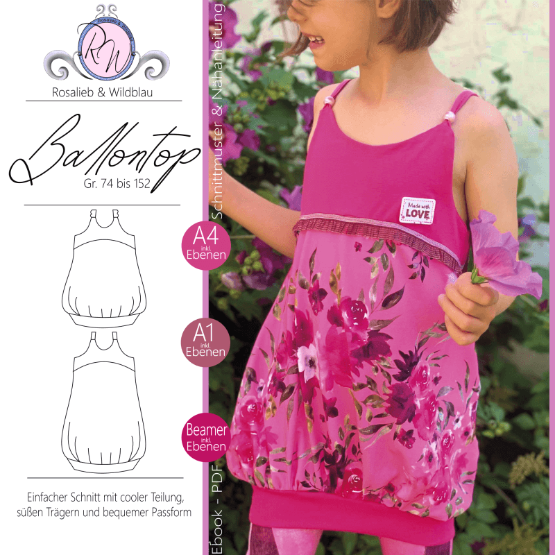 Das Schnittmuster enthält weder Naht noch Saumzugabe und ist in A4 und A1 inkl. Ebenen sowie als Beamerdatei enthalten.Den Schnitt habe ich in Gr. 74 bis 152 in meinem Echtgrößensystem für dich gradiert. Dabei passt z.B. Größe 74 ab einer Körpergröße von 74cm bis 79cm usw. Das Ballontop ist auf Jersey ausgelegt.