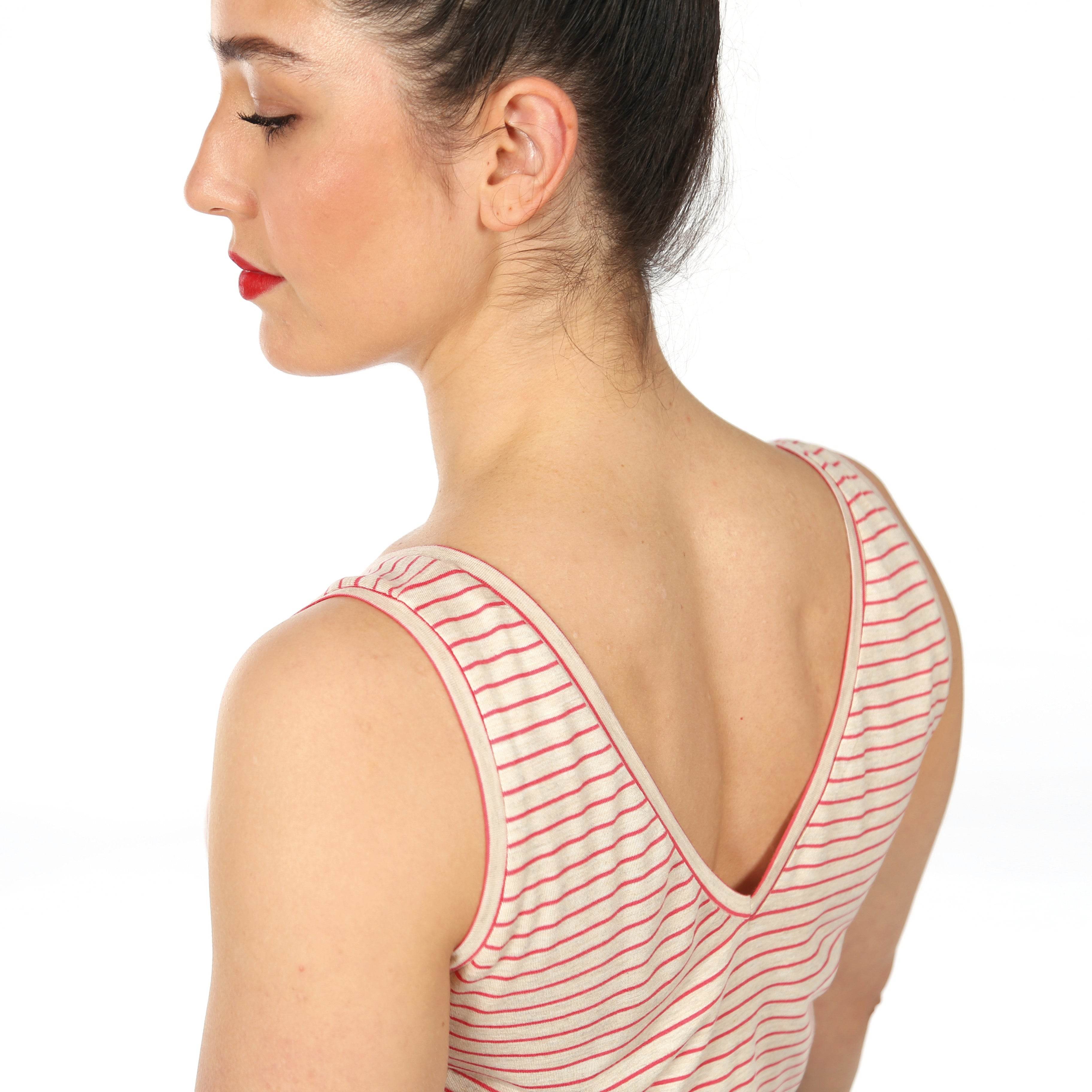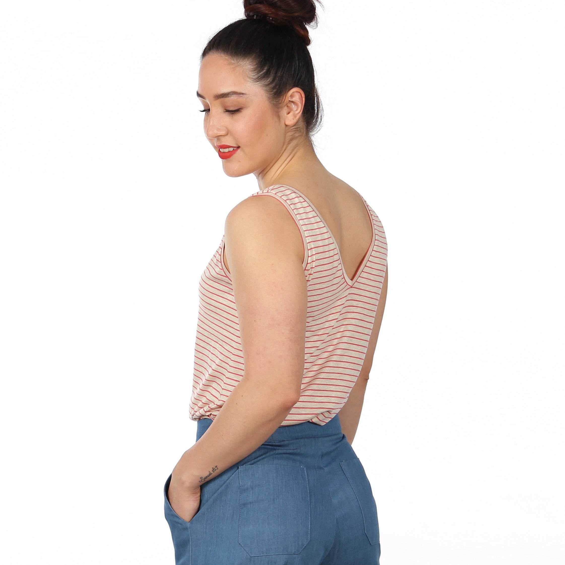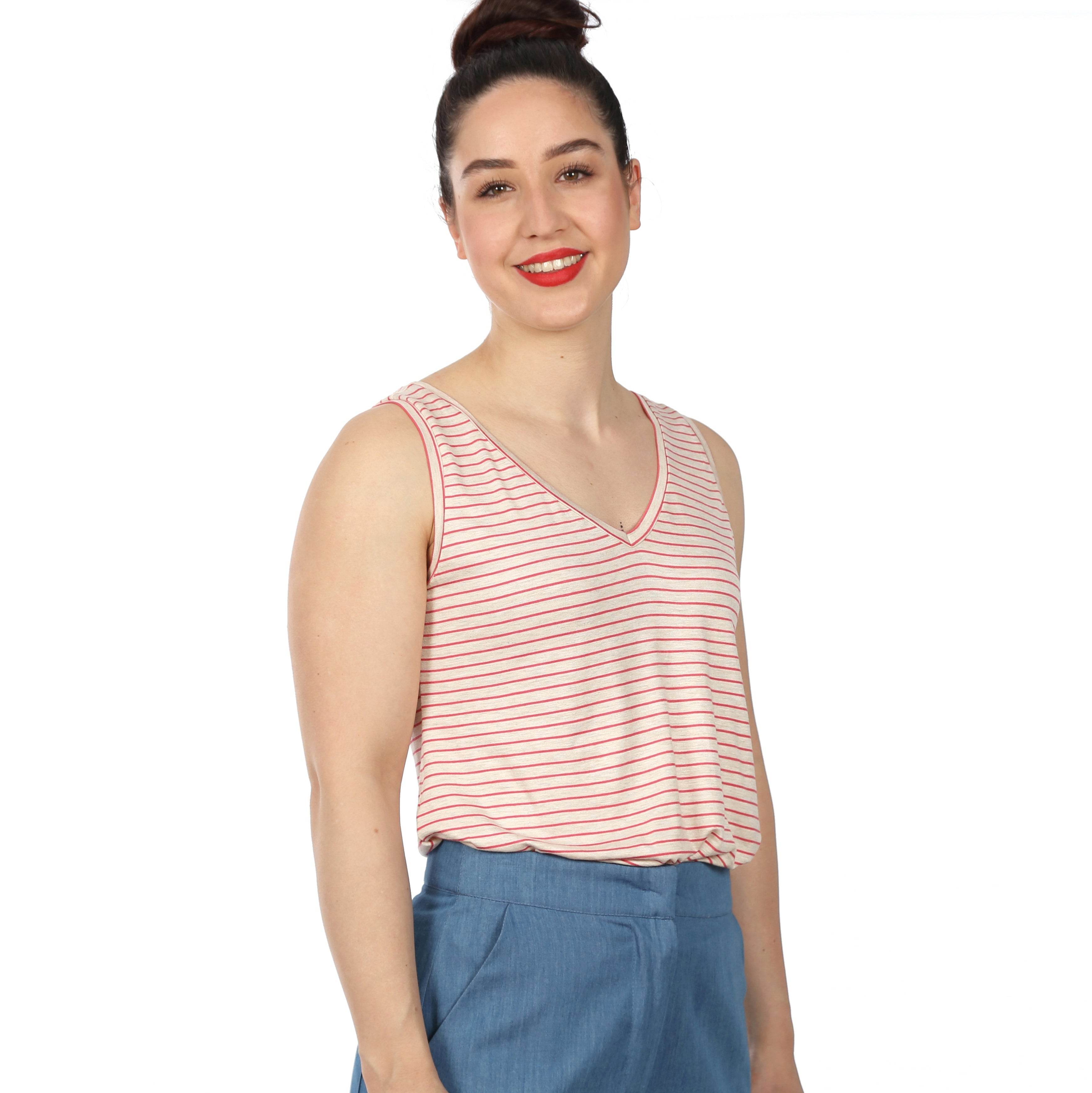 Mit FRAU JILL kannst Du den Sommer in vollen Zügen genießen, denn dieses schöne Jersey-Top ist schnell genäht und ergänzt Deine Garderobe um ein sportlich-feminines Teil. V-Ausschnitte in Vorder- und Rückenteil sind der Eyecatcher an FRAU JILL, sie werden mit schmalen Bündchen eingefasst. Die Trägerbreite ist so gewählt, dass kein BH-Träger herausblitzt. Je nach Auswahl von Stoff, Muster oder Farbe kann FRAU JILL sportlich oder festlich wirken.