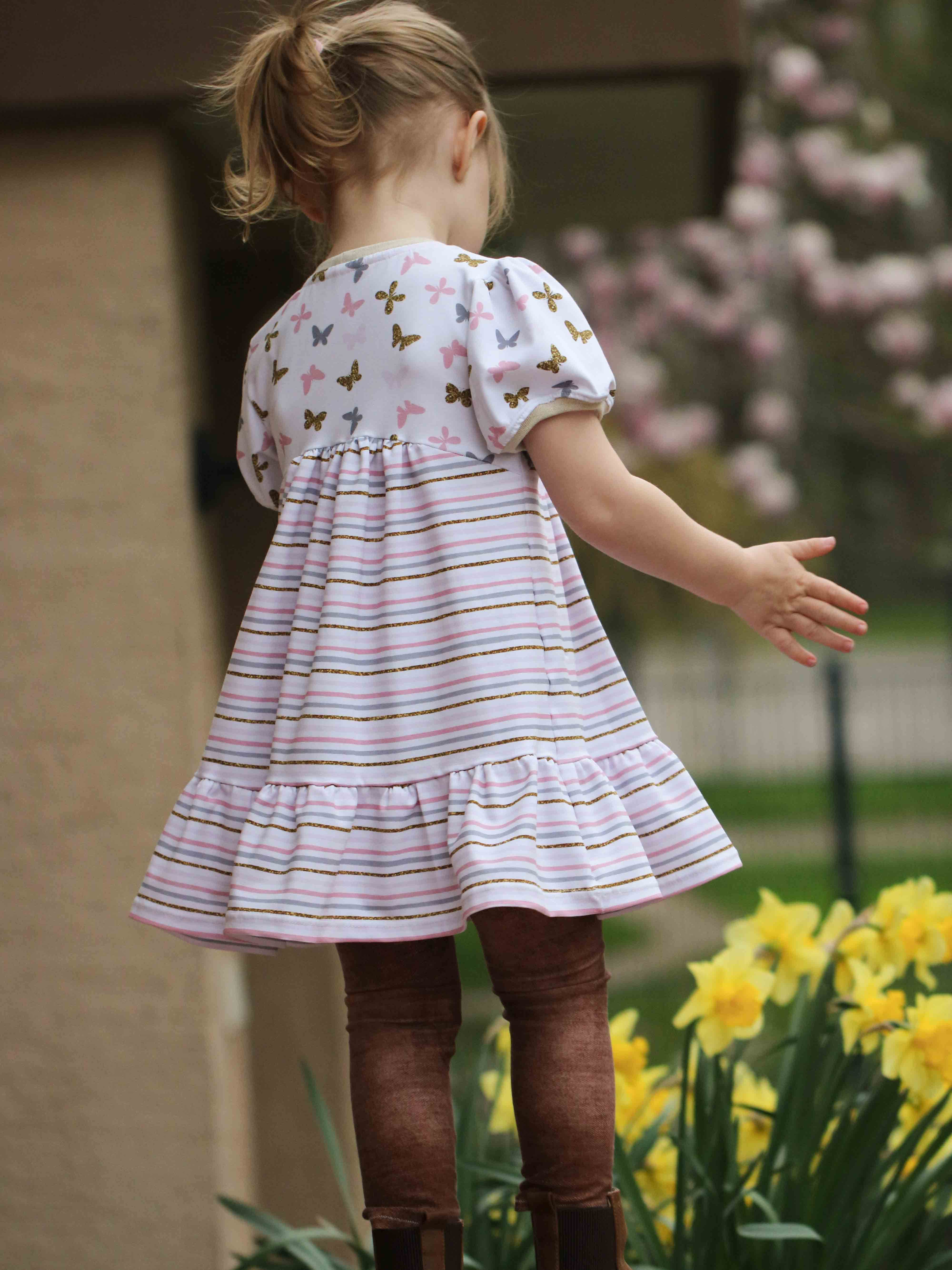 Die Tunika in leichter A-Linie hat ihr Augenmerk auf der vorderen Knopfleiste und kann als Tunika oder Kleid genäht werden. Der Schnitt bietet wunderschöne, verspielte Raffungen und ist ein Must-Have für alle Mädchenmamas!