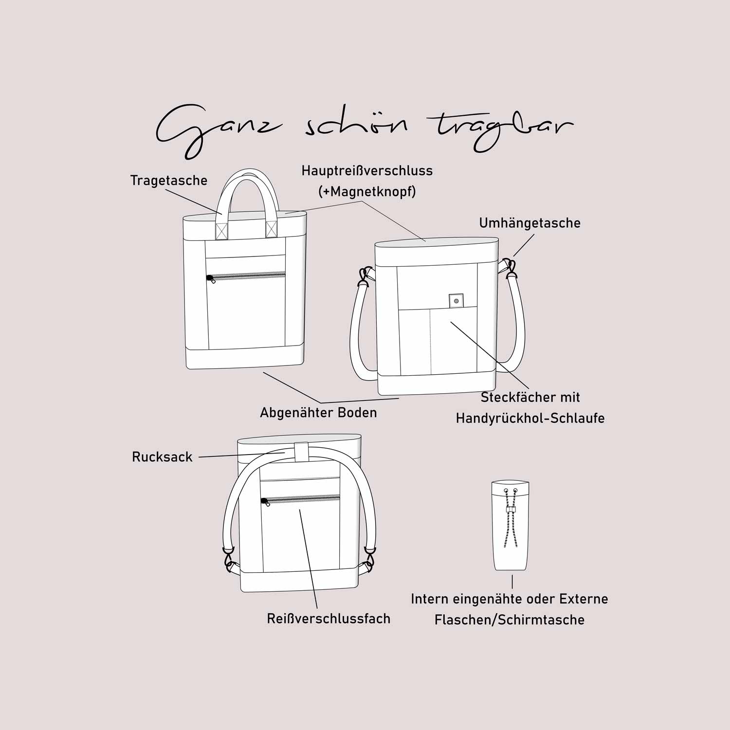 Dieser Schnitt bietet dir eine großzügige, klar strukturierte Alltagstasche mit variablen Trageoptionen. Du kannst sie klassisch in der Hand, über der Schulter, als Crossbody-Variante oder als Rucksack tragen. Durch die durchdachte Außenaufteilung mit Steck- und Reißverschlussfächern sowie das optionale Flaschen- bzw. Schirmtasche lässt sich die Tasche funktional an unterschiedliche Anforderungen anpassen und trägt den schönen Namen "Ganz schön tragbar". Das Schnittmuster beinhaltet natürlich eine ausführliche Anleitung und die Fertigmaße 40x34x8cm und wird dir nach dem Kauf als Sofort Download in PDF Format zur Verfügung gestellt.