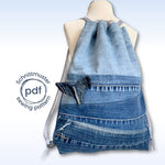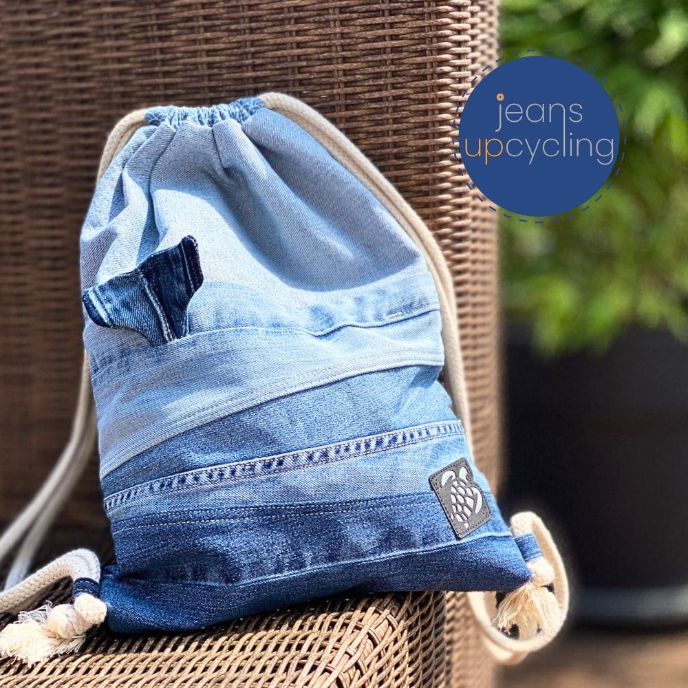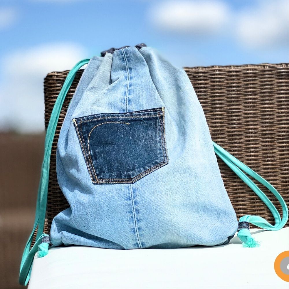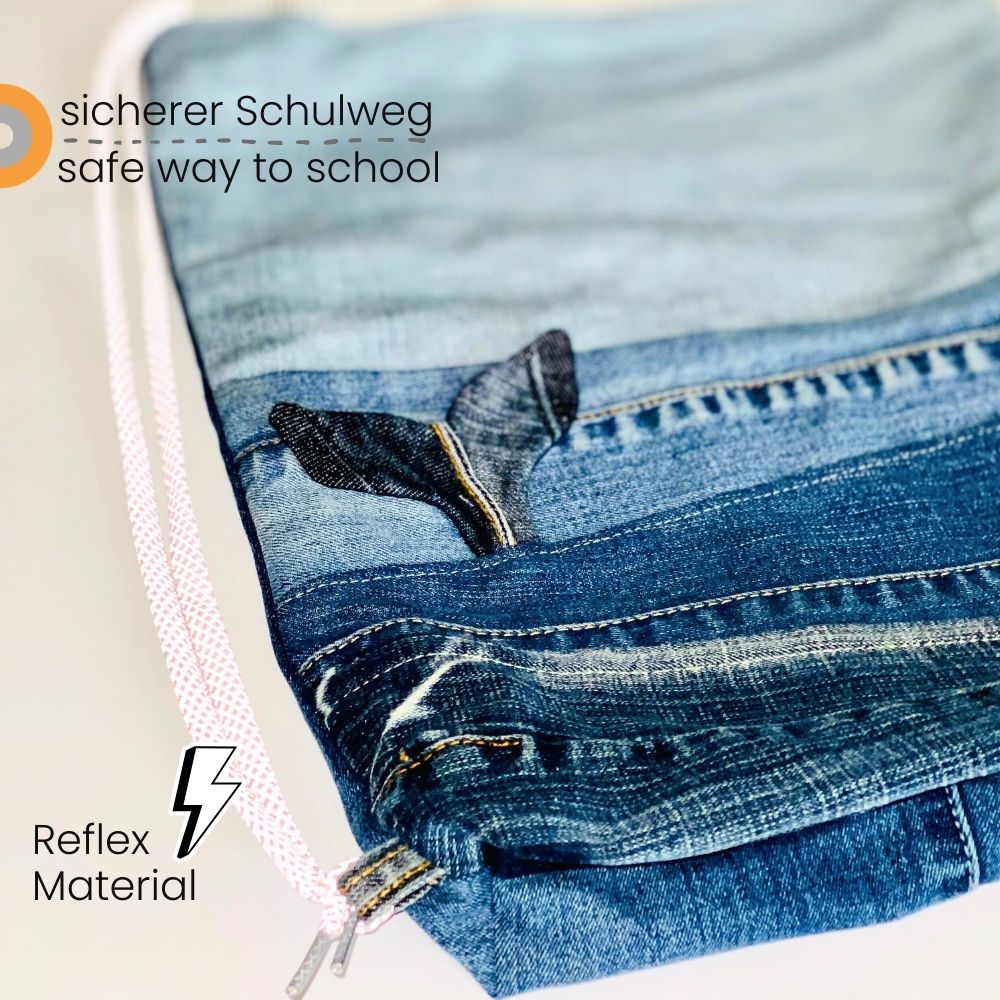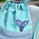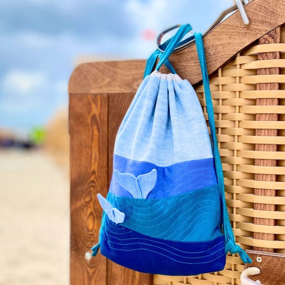 Genau dieses Gefühl steckt im Turnbeutel-Schnittmuster MOVE. Eine Walflosse taucht aus dem „Wasser“ auf, das durch die besonderen Blautöne alter Jeans lebendig wird.