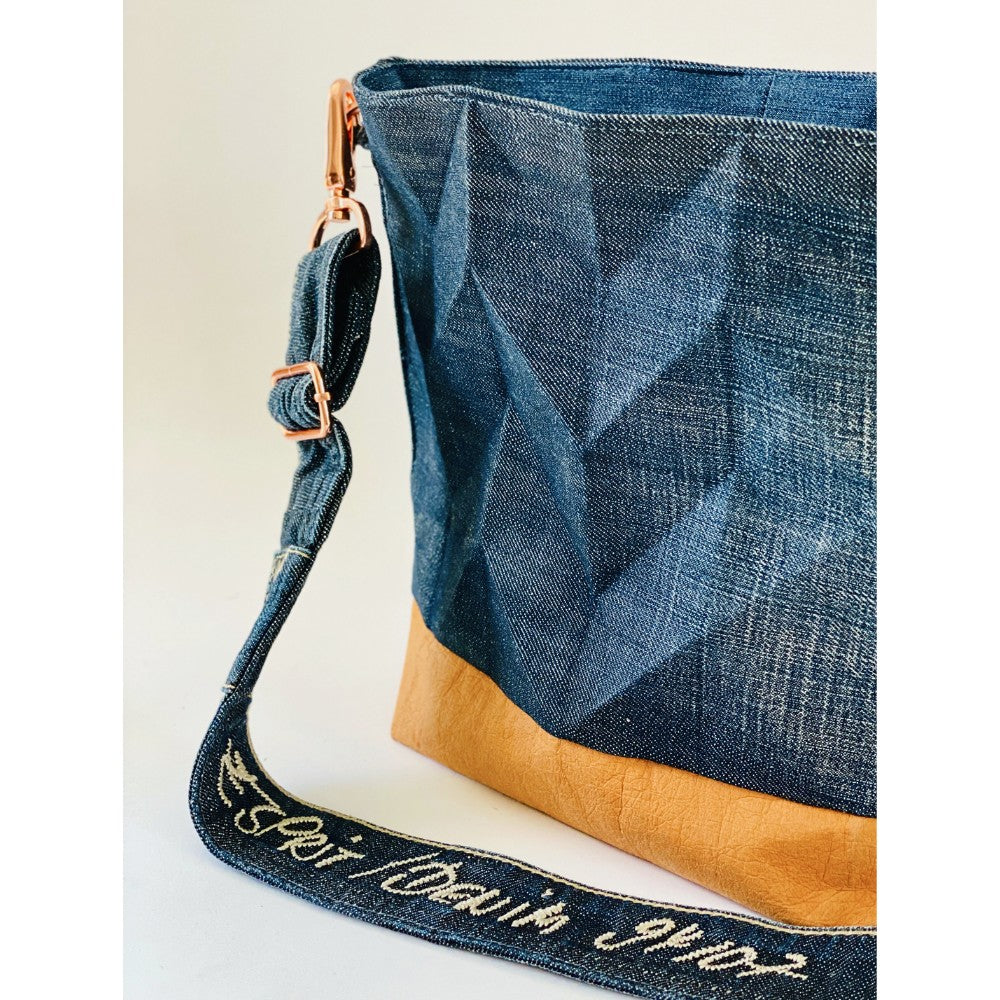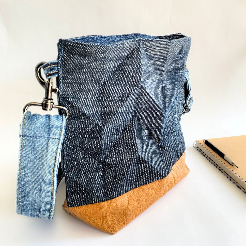 ORIJ ist eine Umhängetasche mit plastischen 3-D Falten. Die Falten werden dauerhaft eingebügelt und geben der Tasche optimalen "Stand". Sicher verschlossen durch einen Zipper, passen alle wichtigen Dinge in die kleine Umhängetasche. ORIJ die Handtasche, die Origami und Jeans Upcycling kombiniert.