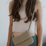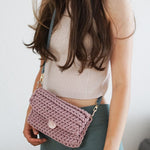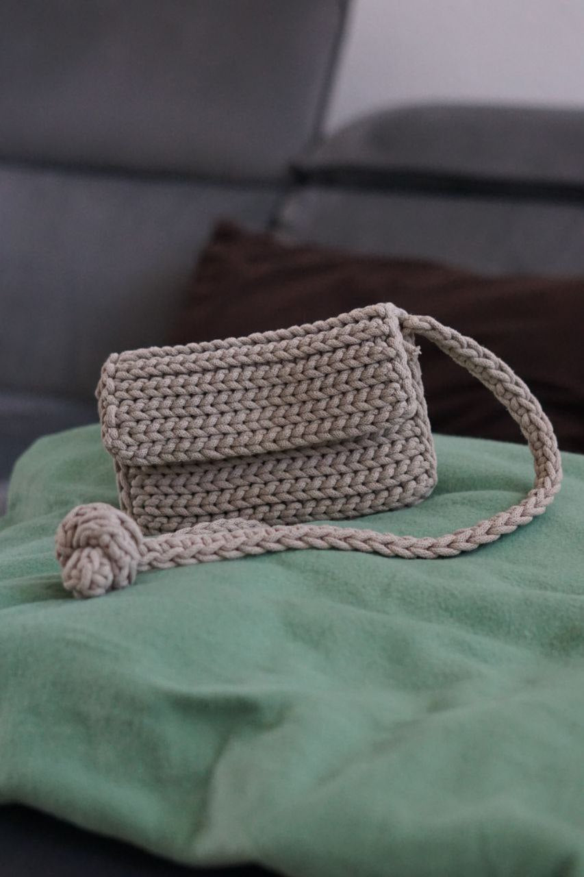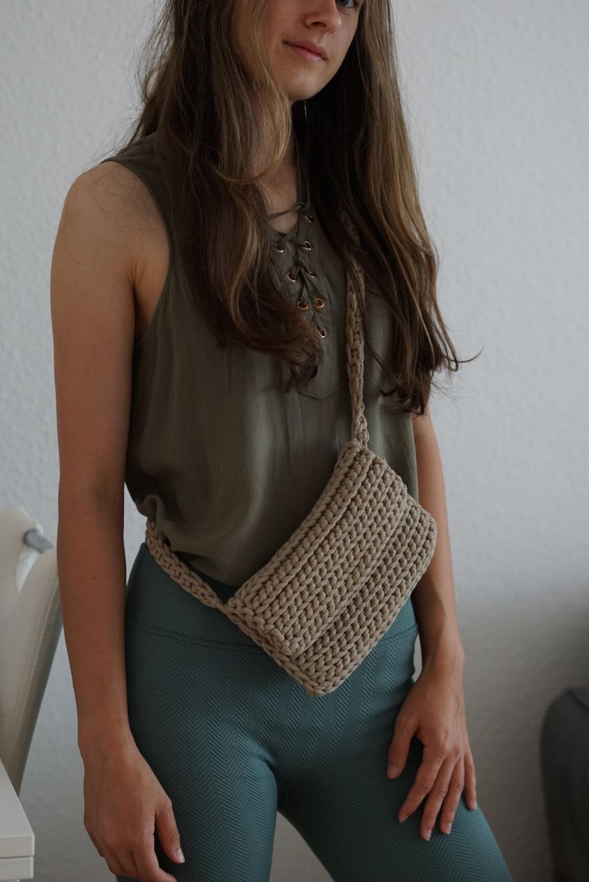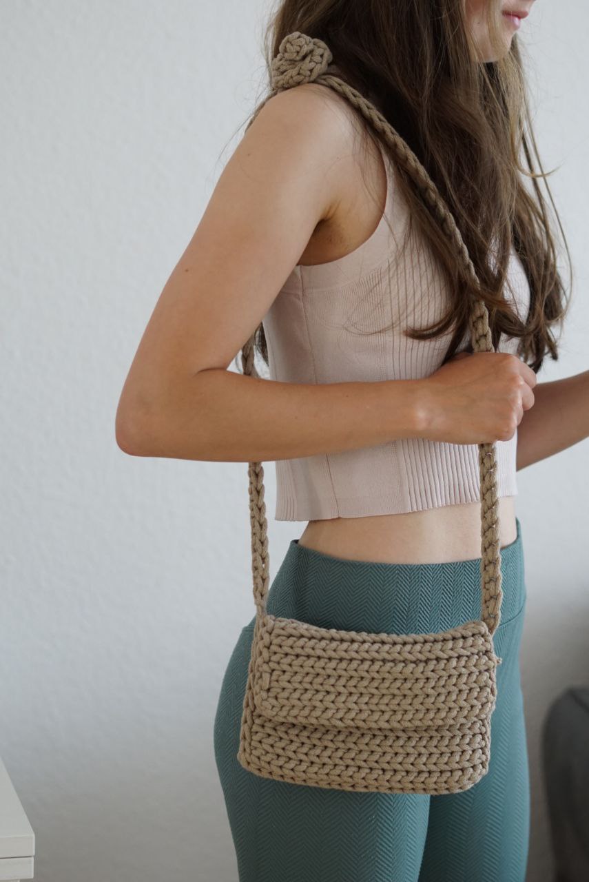 Die Tasche wird im Flechtmuster, von unten nach oben, in Reihen gehäkelt und später an den Seiten zusammengehäkelt. So bekommt die Tasche, durch die seitlichen Nähte, eine gewisse Formstabilität.