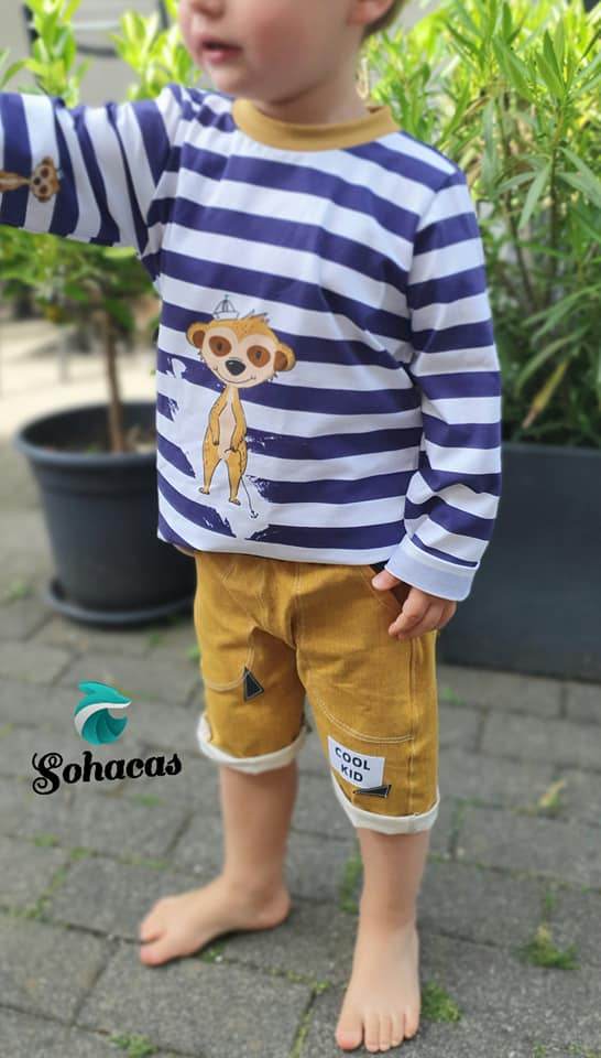 Das Flat Shirt ist ein locker geschnittener unisex Basic Schnitt in den Größen 62-134. Du kannst verschiedene Varianten nähen: T-Shirt, Longsleeve und ein angenähtes Schößchen. Genäht wird am besten aus Jersey oder ähnlicher Stoffart. Für das Bündchen wird ausdrücklich Bündchenstoff verwendet.