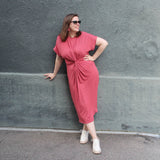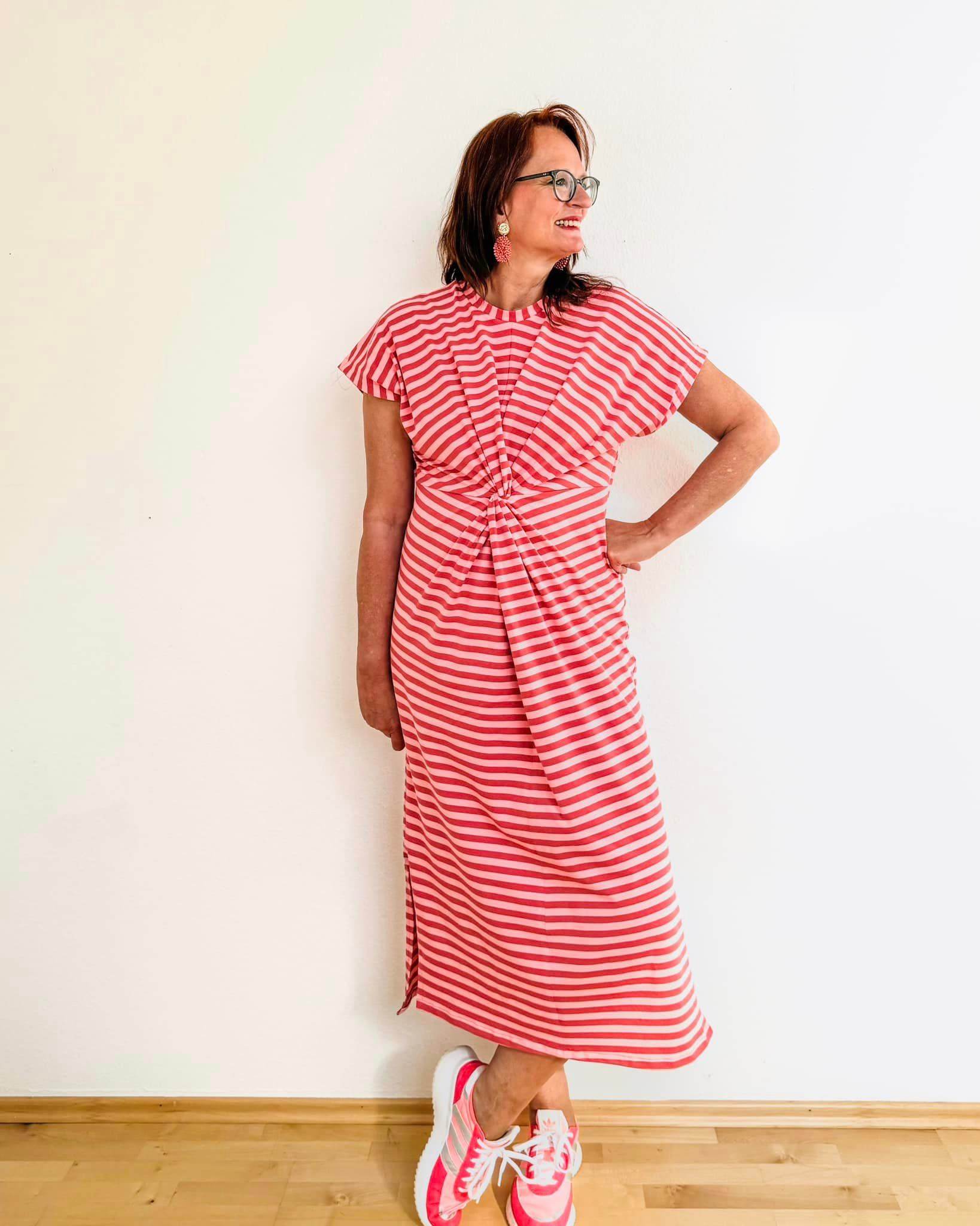 Kleid Dreje ist ein wunderschönes Kleid mit Knotendetail. Es fällt im Bauchbereich schön locker und kaschierend, an den Seiten formt es dennoch eine schöne Silhouette. Du wirst es lieben.
