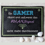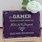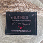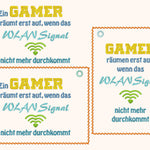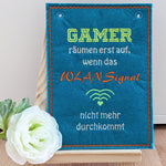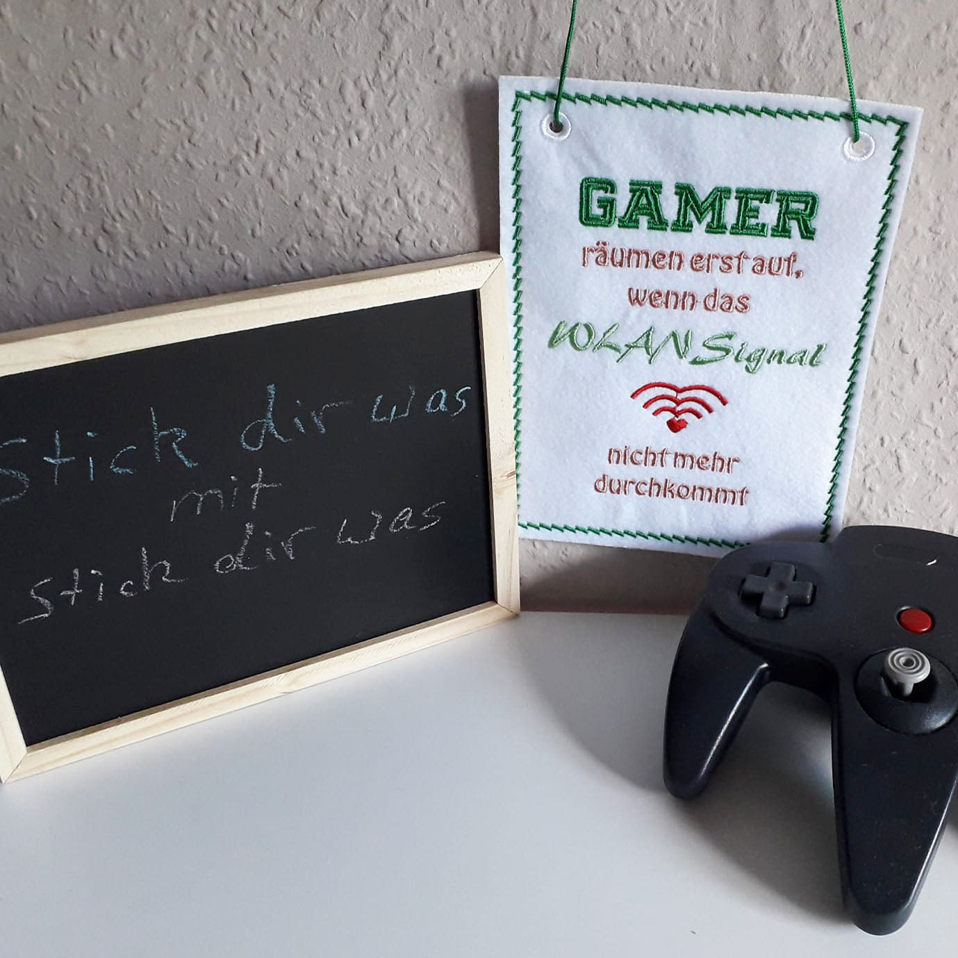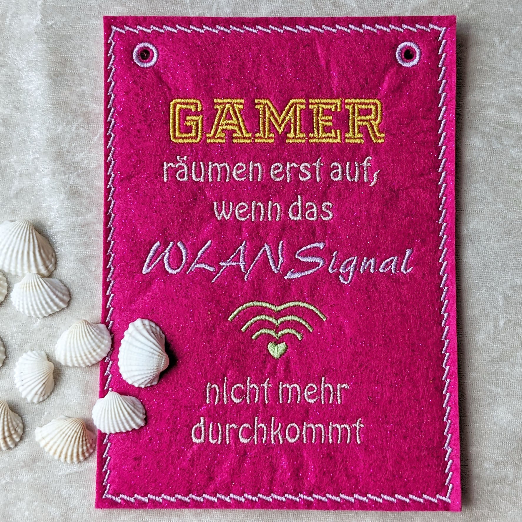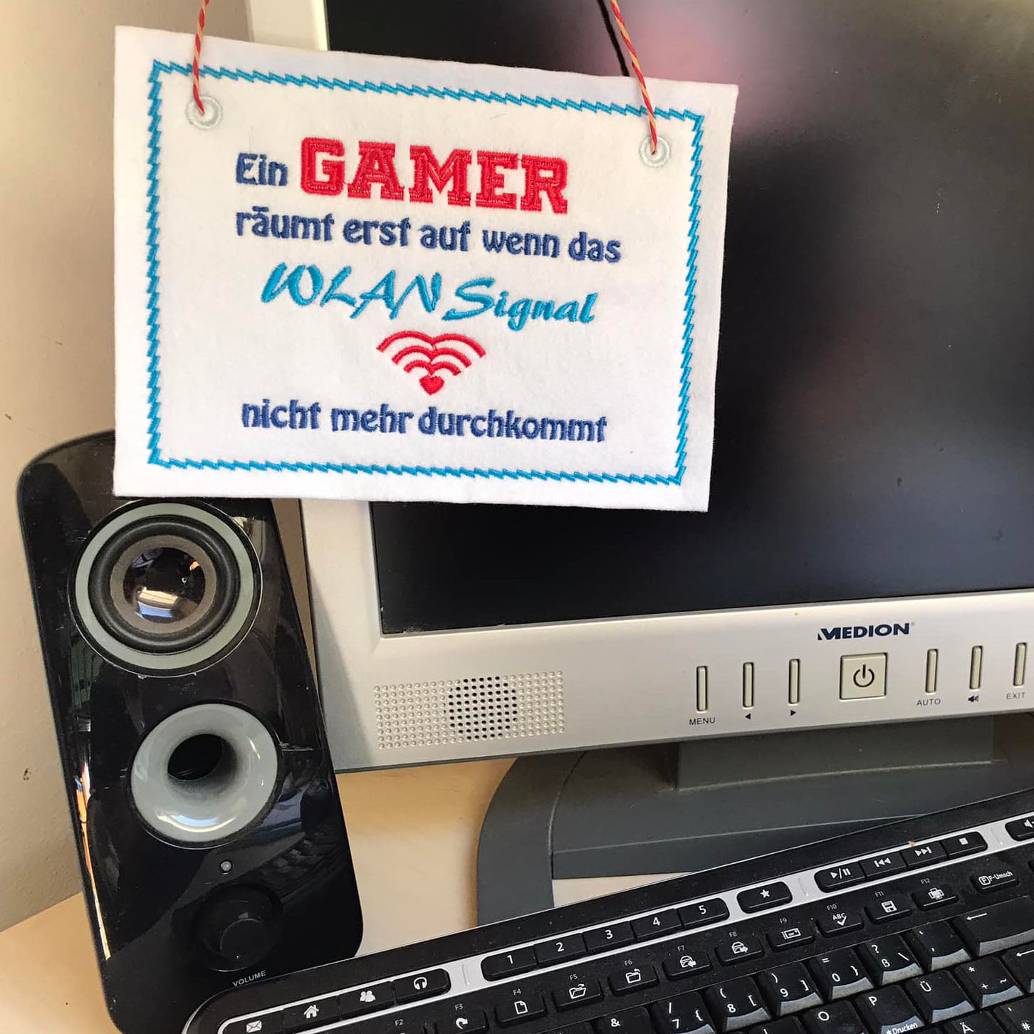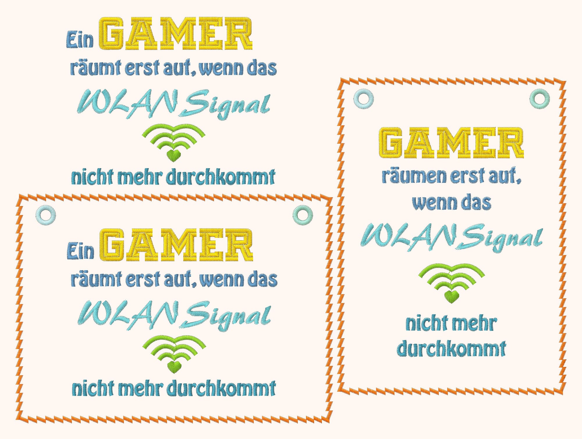 ITH Stickdatei mit dem Text "Gamer räumen erst auf, wenn das WLan Signal nicht mehr durchkommt" hochkant, quer und Text einzeln.