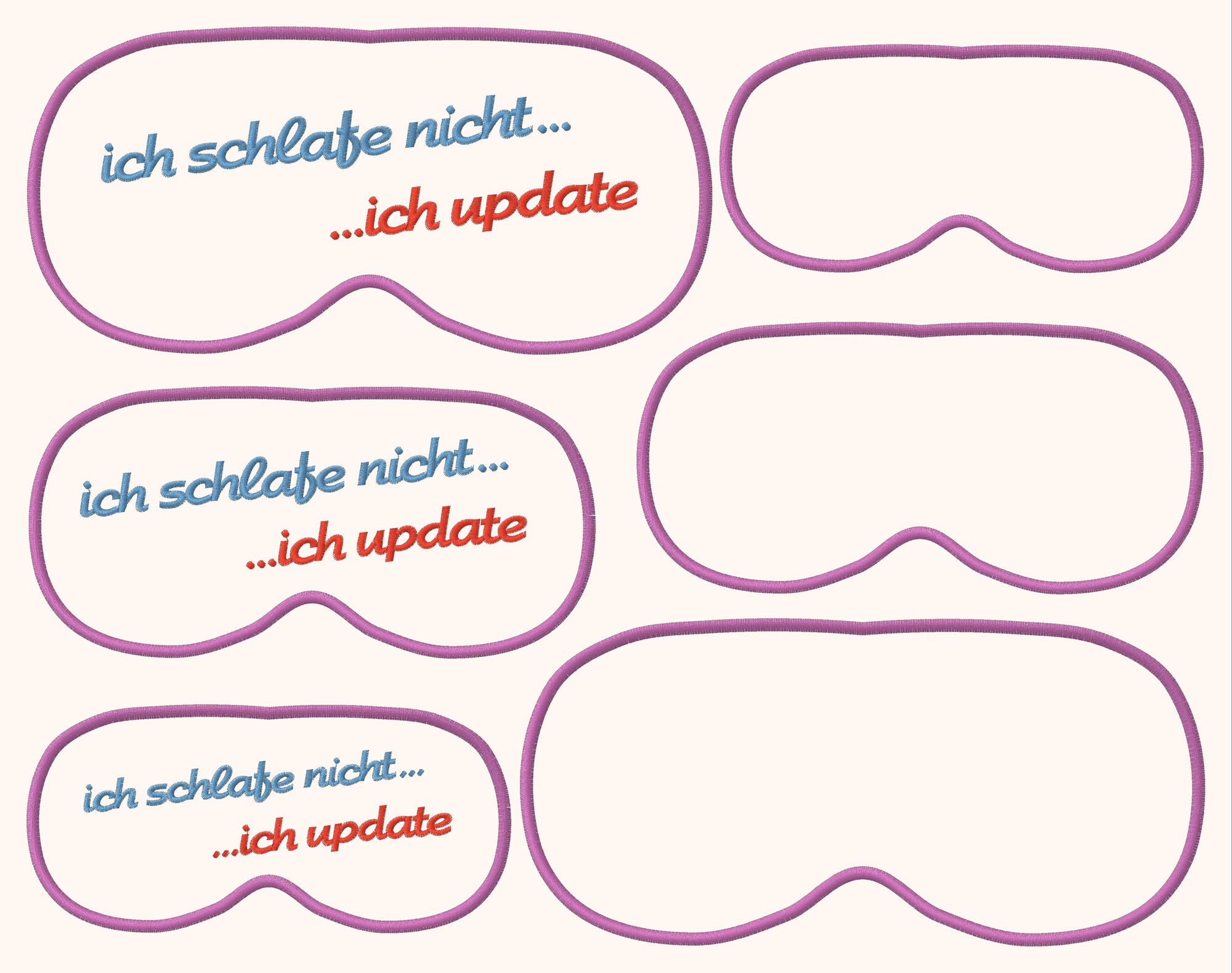 Schlafmaske Stups 6x Stickdatei für kleine Nasen mit Text "Ich schlafe nicht, ich update" oder Blanko in je drei Größen ab 13x18 cm