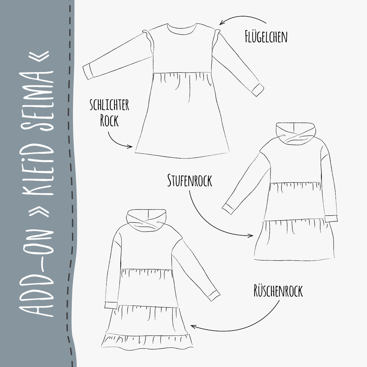Das AddOn beinhaltet 3 verschiedene Rockvarianten sowie Flügelchen für die Ärmelnähte, um ein lässiges oder süßes Kleid aus dem Grundschnitt SELMA zu nähen.