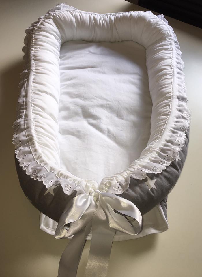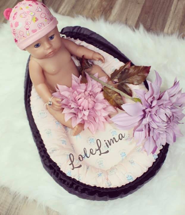 Das Babynest gibt es in zwei verschiedenen Ausführungen: eine kleinere, die sich super für ganz kleine Babys oder Puppen eignet, und eine größere, in die größere Babys hineingelegt werden können. Das Nestchen hat eine mit Watte gefüllte Krempe, die mit Bändern gerafft wird, was zu einer Bootsform führt. Das Nestchen eignet sich für Momente, in denen das Baby gerne auf dem Rücken liegt und der Körper Zurückhaltung braucht. Die Bänder ermöglichen es Ihnen auch, das Nestchen weiter oder näher zu ziehen, je nachdem, was Ihr Baby braucht. Die kuschelige Umrandung beruhigt und vermittelt ein „Geborgen-Werden“-Gefühl. Auch ältere, beweglichere Krabbelbabys lieben das Nest für ein Mittagsschläfchen.