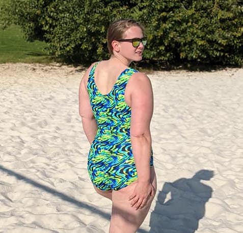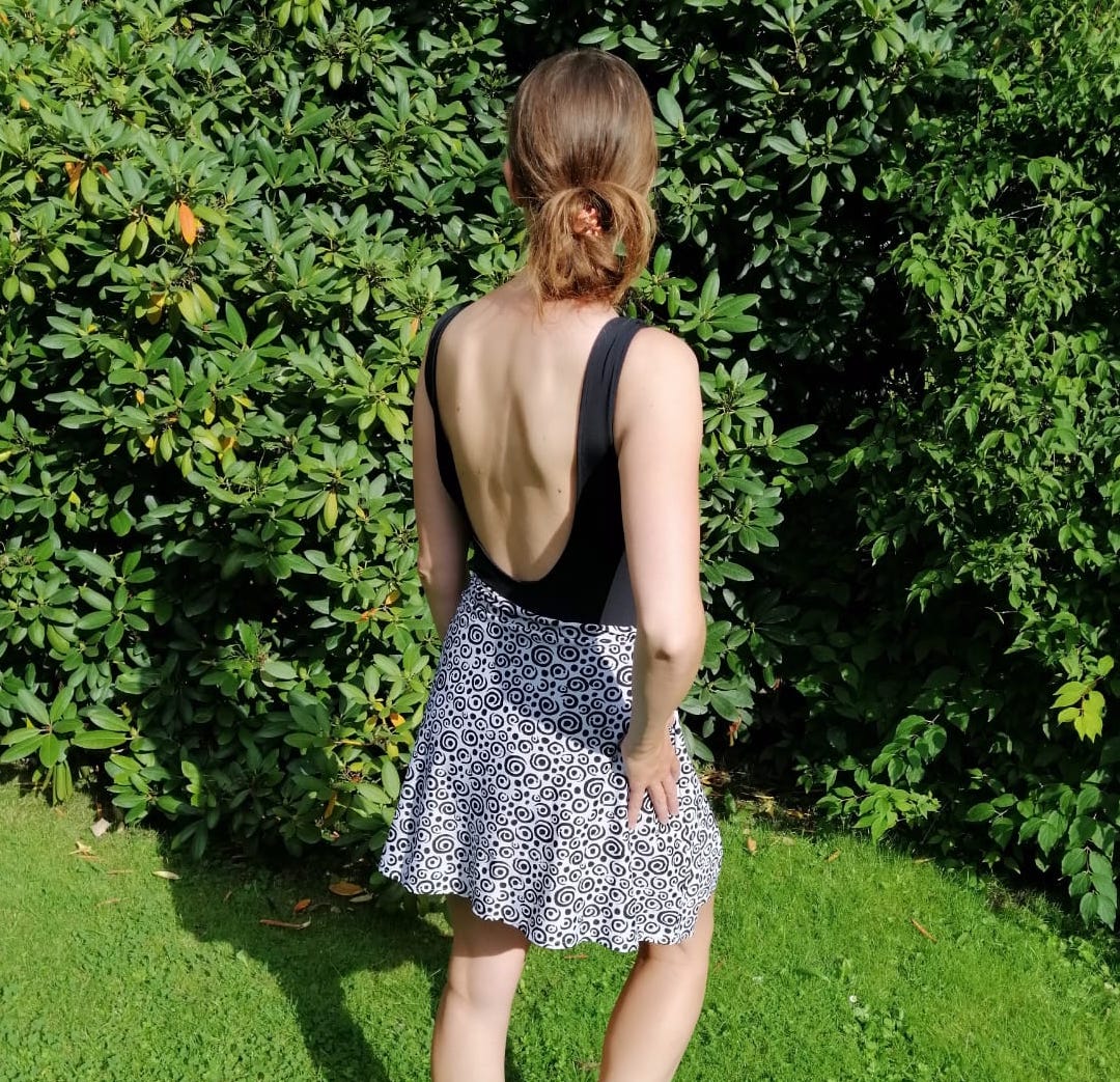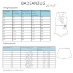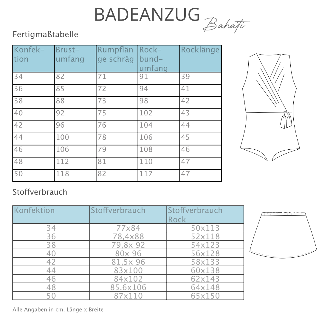 Bahati ist ein klassischer Badeanzug, der körpernah sitzt und in der Grundform den Körper gut bedeckt. Optional gibt es einen höheren Beinausschnitt und einen tiefen Rückenausschnitt. Du kannst dich zwischen glatten oder gerafften Fronten entscheiden. Die Bein- und Armausschnitte können gesäumt werden (ggf. Gummi einnähen). Das Schnittmuster beinhaltet auch einen höheren Beinausschnitt als Variante, die du einfach am Hauptschnitt auswählen kannst. Für alle mit Hohlkreuz gibt es eine Rückenvariante mit Abnäher, oder du nutzt die Anleitung für eine Schnittanpassung. Für alle die ungern in der Öffentlichkeit im Badeanzug herumlaufen, gibt es einen zusätzlichen Rock, der ebenfalls aus Badelycra gefertigt wird. Mit diesem kannst du auch ins Wasser gehen. Er hat eine optionale Teilung in der Mitte.