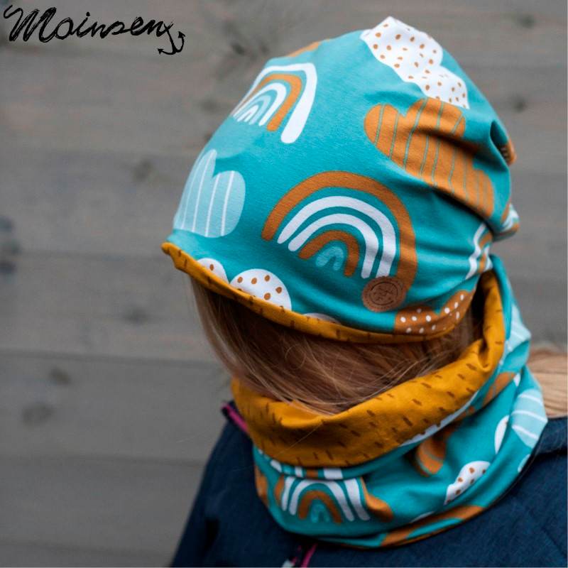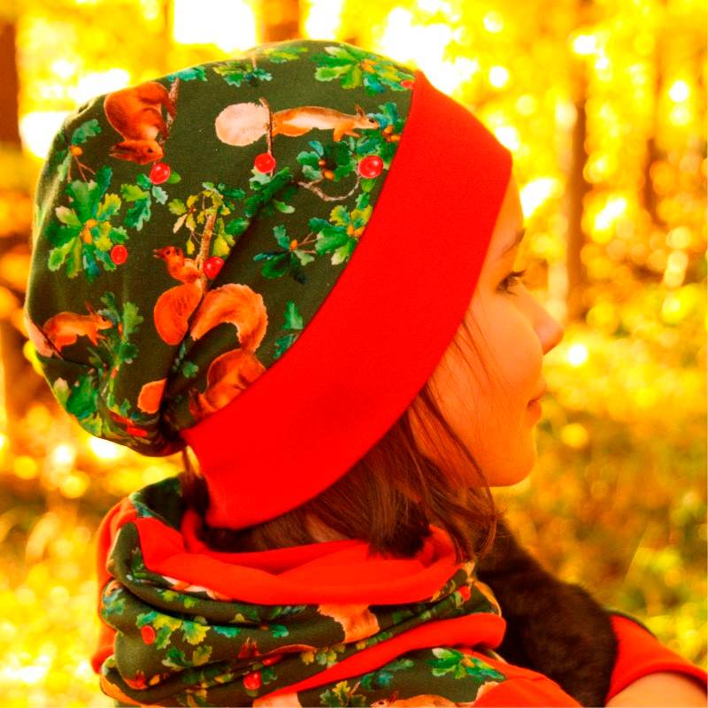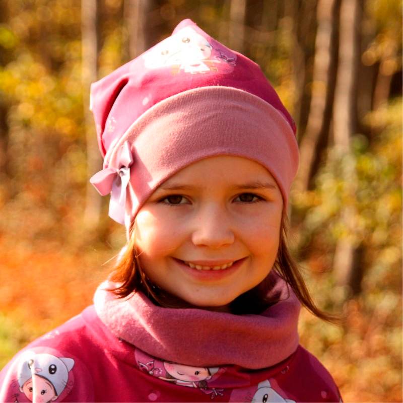 Für Abwechslung auf dem Kopf habt ihr mehrere Möglichkeiten dieses Set zu nähen. Die Mütze kann mit oder ohne Teilung, einlagig, zweilagig, als Wendemütze oder mit Bündchen genäht werden. Auch beim Loop habt ihr mehrere Optionen. Wollt ihr es schlicht, näht ihr ihn einfarbig, ihr könnt ihn aber auch mit Teilung nähen oder ganz raffiniert mit einer Drehung. Die Anleitung zu allen Varianten findet ihr im E-Book.