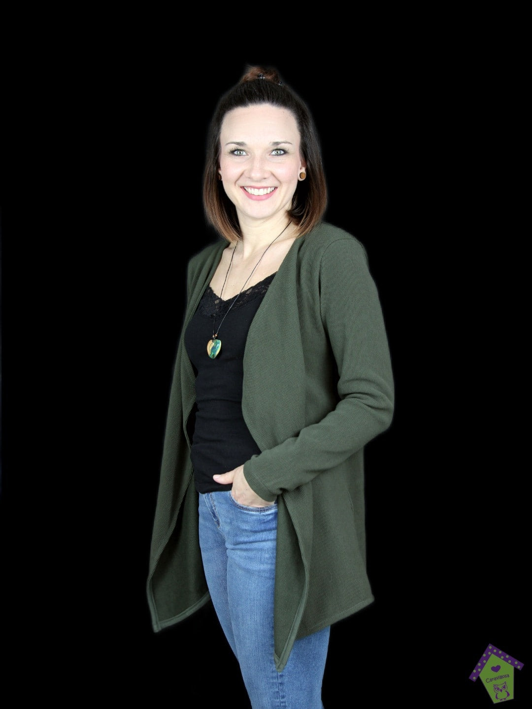 Designdetails: langärmeliger Cardigan, vorn offen, mit 3 verschiedenen Frontdesigns, wird komplett eingefasst oder gesäumt
