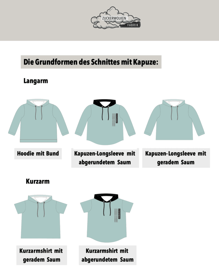 - den Hoodie nähst du am besten aus Sommersweat, French Terry, Ottomanjersey, Rippjersey ab 250g/qm