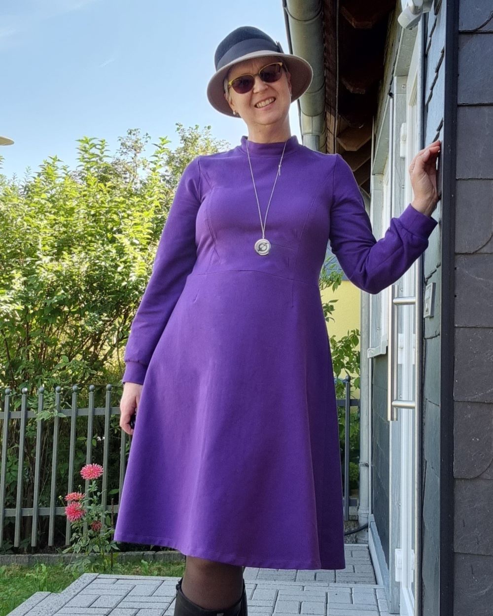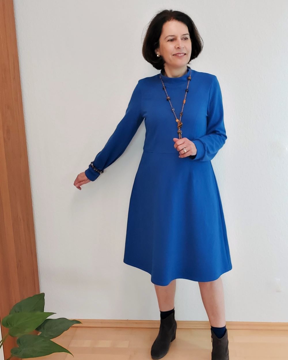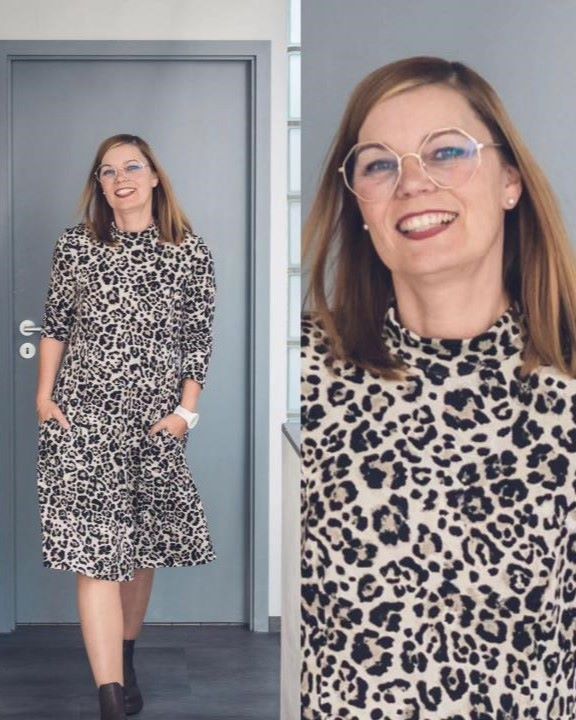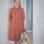 Das Kleid hat eine leicht erhöhte Taillennaht und die Taille ist etwas weiter konstruiert, damit auch alles passt. Die A-Linie am Rock entsteht durch die seitlich ausgestellte Saumweite.