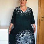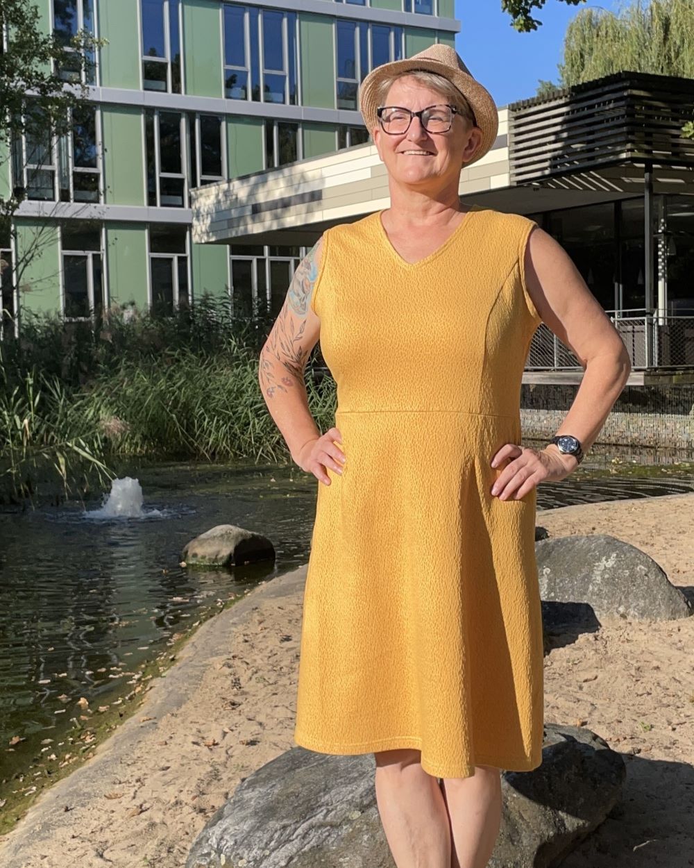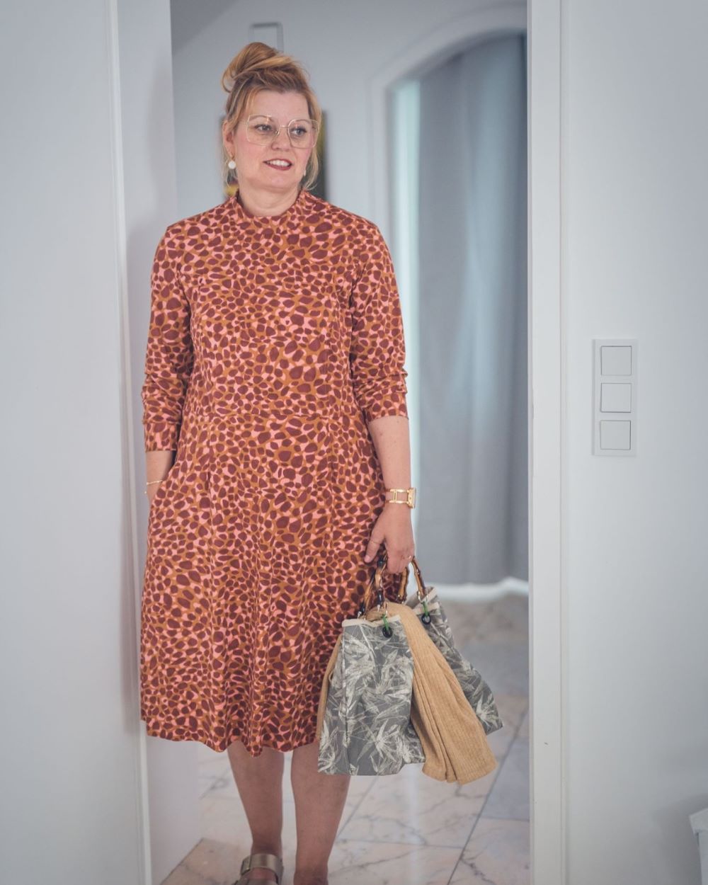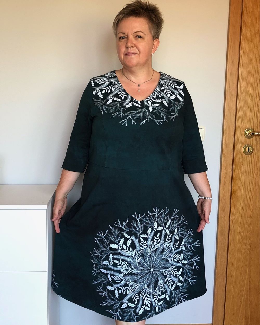 Das Kleid hat eine leicht erhöhte Taillennaht und die Taille ist etwas weiter konstruiert, damit auch alles passt. Die A-Linie am Rock entsteht durch die seitlich ausgestellte Saumweite.