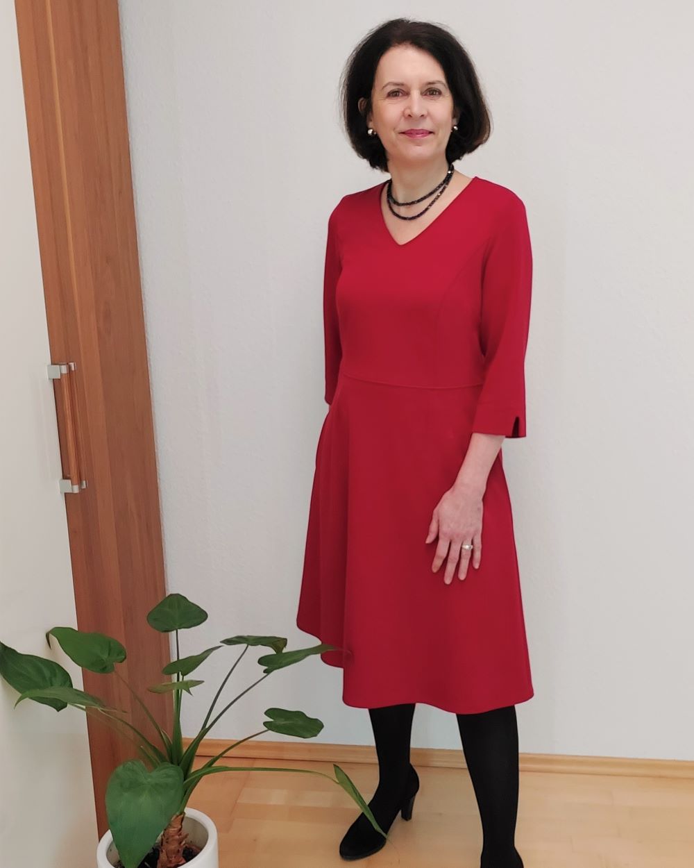 Daria – Kleid mit ausgestelltem Rock. Die Nähte im Oberteil sind Ziernähte und geben dem Kleid gleichzeitig die nötige Passform.