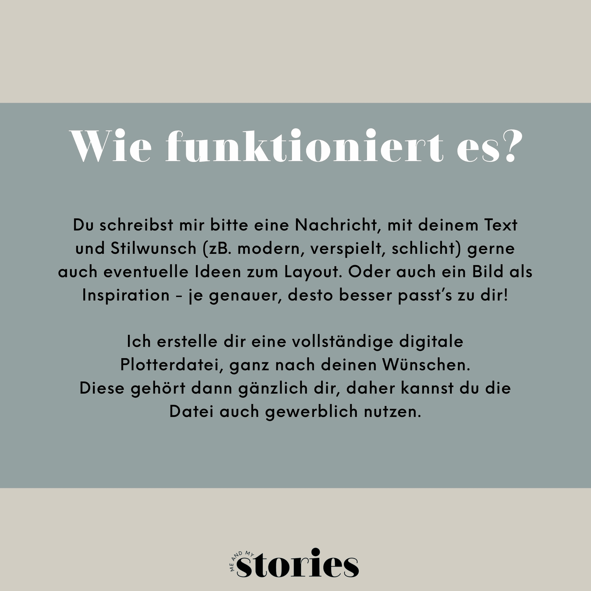 Bitte beschreibe mir möglichst genau, was du dir wünschst – deinen Stilwunsch (z. B. modern, verspielt, schlicht) und eventuelle Ideen zum Layout. Gerne auch ein Bild als Inspiration – je genauer, desto besser passt’s zu dir! Dazu schreibe mir bitte BEVOR du einen Kauf tätigst, eine Nachricht und wir gestalten deine Plotterdatei gemeinsam - ganz individuell!